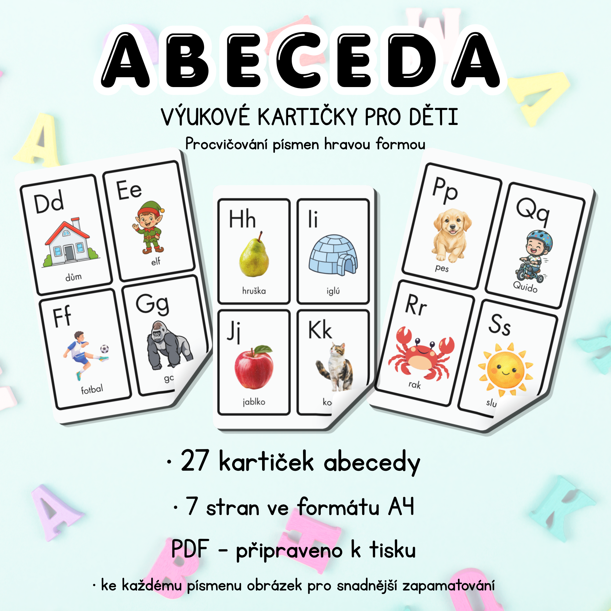 Soubor výukových kartiček pro hravé procvičování abecedy. Materiál obsahuje 27 kartiček s písmeny a obrázky, které pomáhají dětem lépe si zapamatovat jednotlivá písmena. Vhodné pro děti v mateřské škole i na začátku 1. třídy. PDF ve formátu A4 je připravené k tisku. Pro delší životnost doporučujeme kartičky po vytištění zalaminovat. 📚