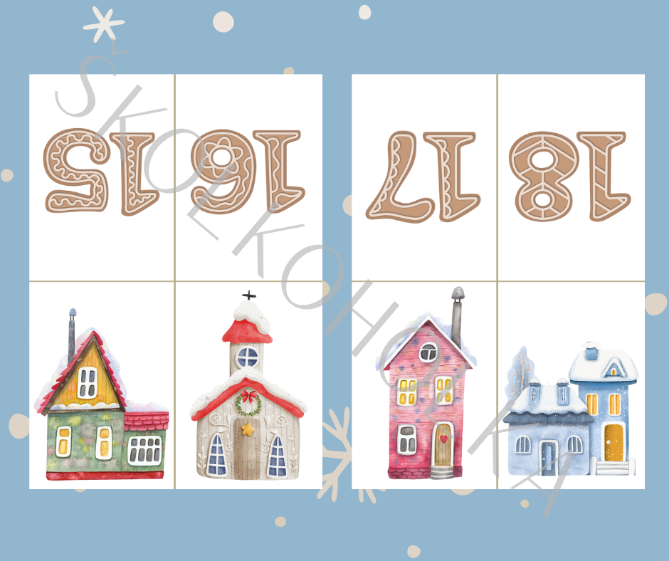 Můžete také kartičky vystřihnout a přeložit před 1. prosincem, pověsit na kolíčky na šňůru a každý den otočit a postavit část vesničky. Vždy rozstřihněte papír uprostřed podle podélné čáry uprostřed (na výšku) a přehněte každou kartu. Na jedné straně bude číslo 🔢 a na druhé obrázek 🖼️.