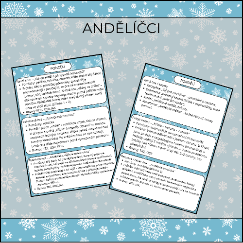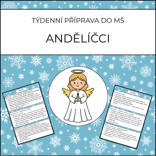 Když se ve třídě rozezní rolnička, v okně „svítí“ hvězda a všude blikají světýlka, začíná vánoční čas. Digitální materiál „Andělíčci“ vás provede dny plnými laskavosti, spolupráce, pohybu a tematiky andílků. Děti si vyzkoušejí andělskou pomoc v praxi, užijí si běhačky, hry s míčem i padákem a vytvoří jednoduché (a smysluplné) andělské výrobky nebo hudební aktivity bez zbytečných příprav.
