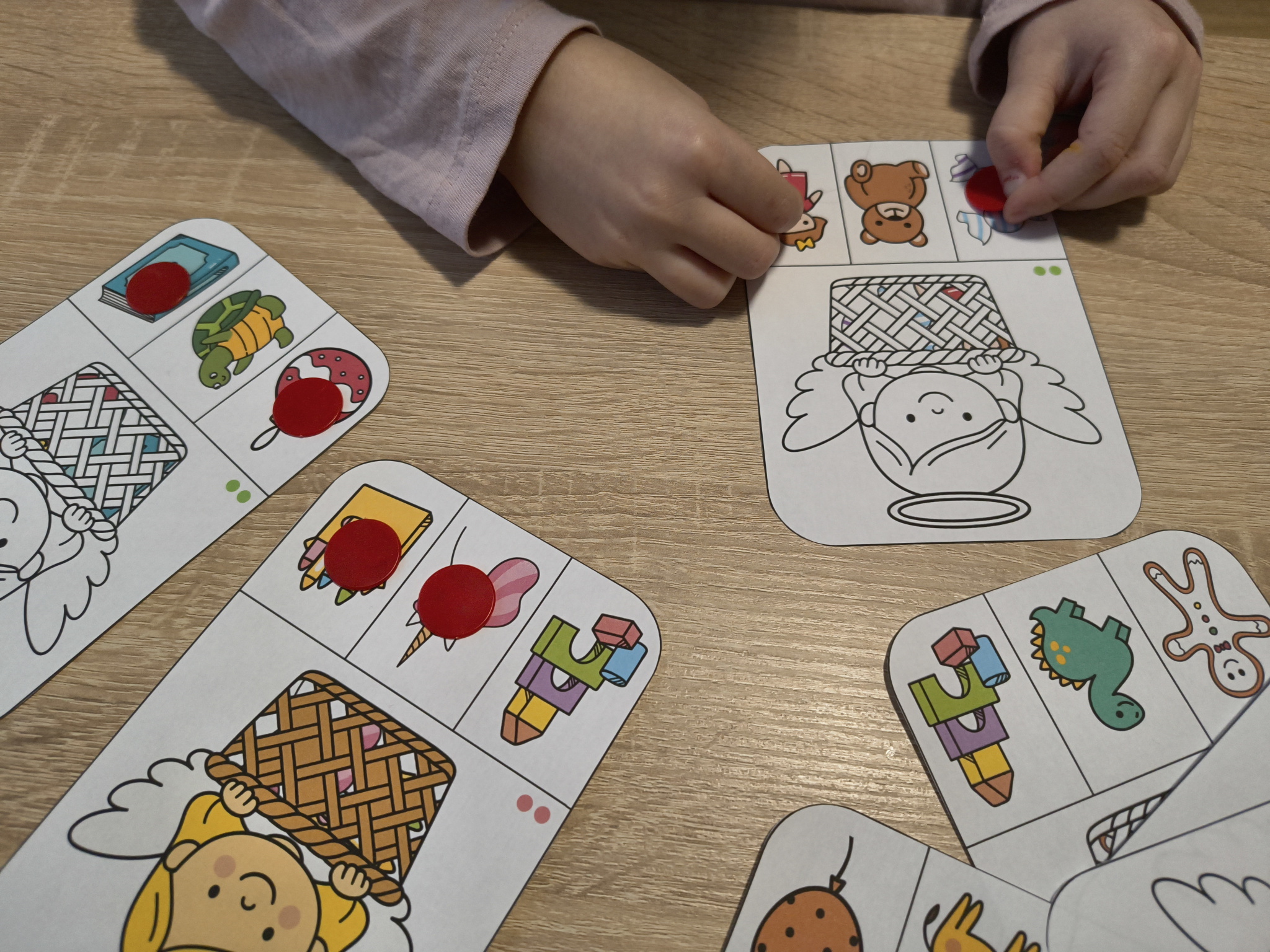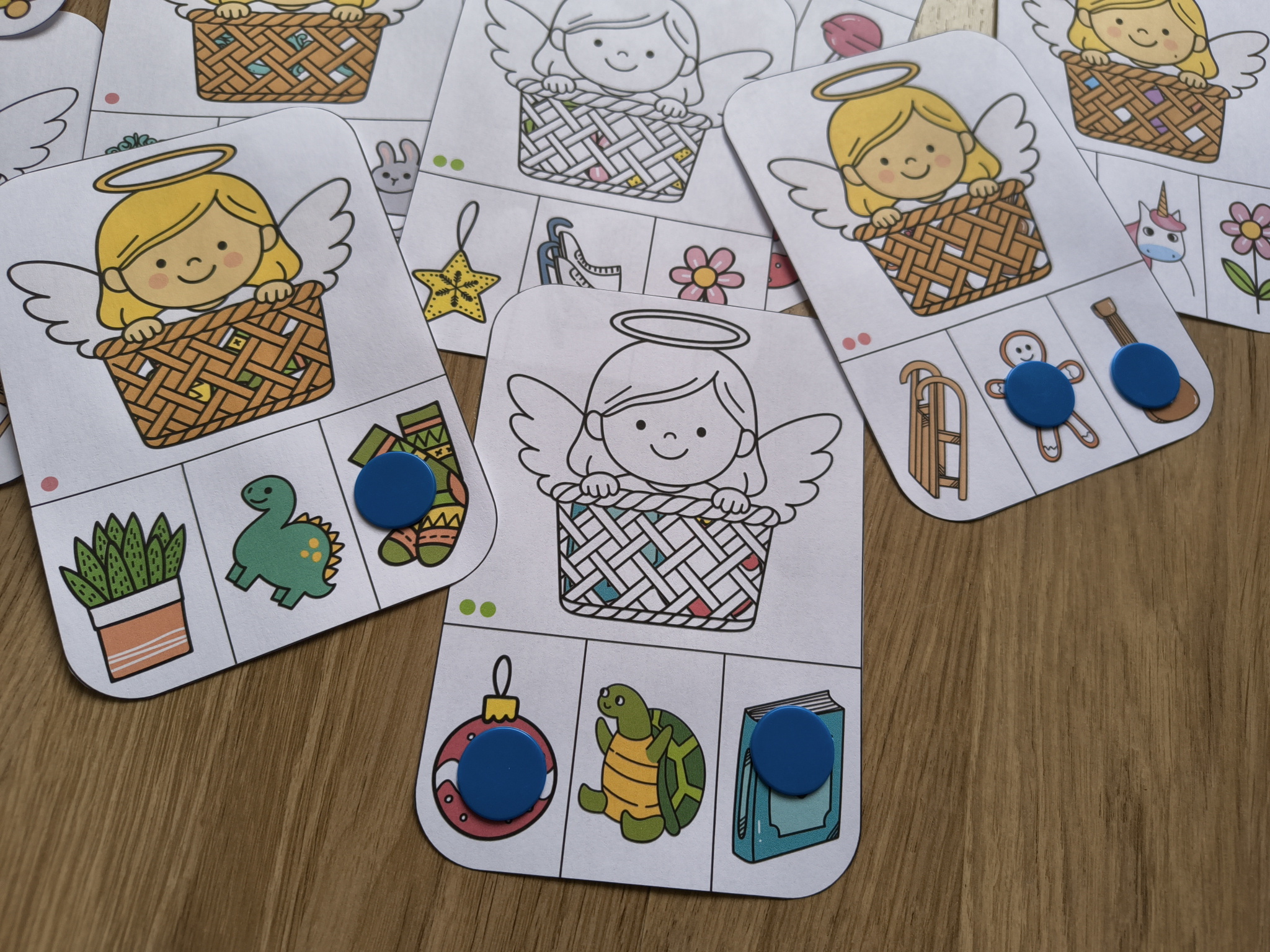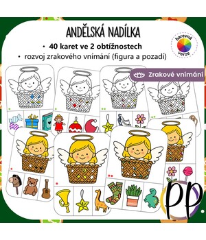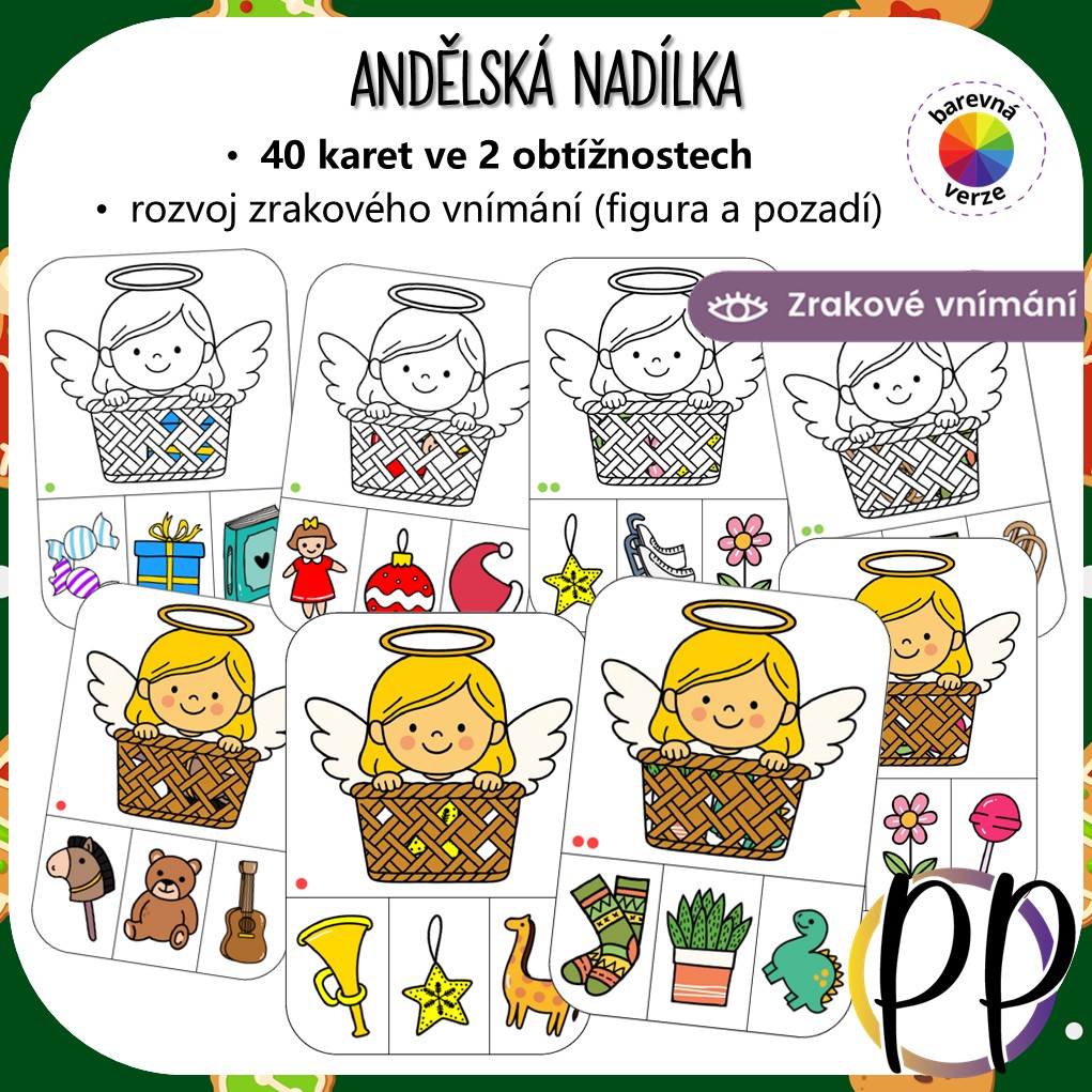 Soubor obsahuje 40 karet ve velikosti 9x13 cm ve 2 obtížnostech s andílkem a ošatkou, ve které se ukrývají nejrůznější dárečky. Karty můžete vystřihnout a pracovat s nimi pomocí kolíčků, modelíny nebo žetonků. Můžete je také využít v podobě listů, u kterých lze kromě drobných předmětů k přikládání použít stírací fix.