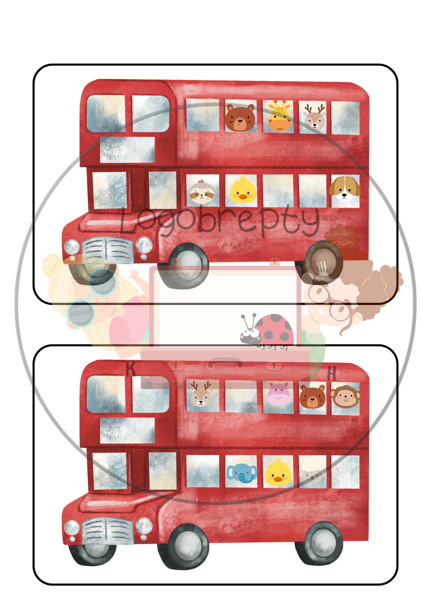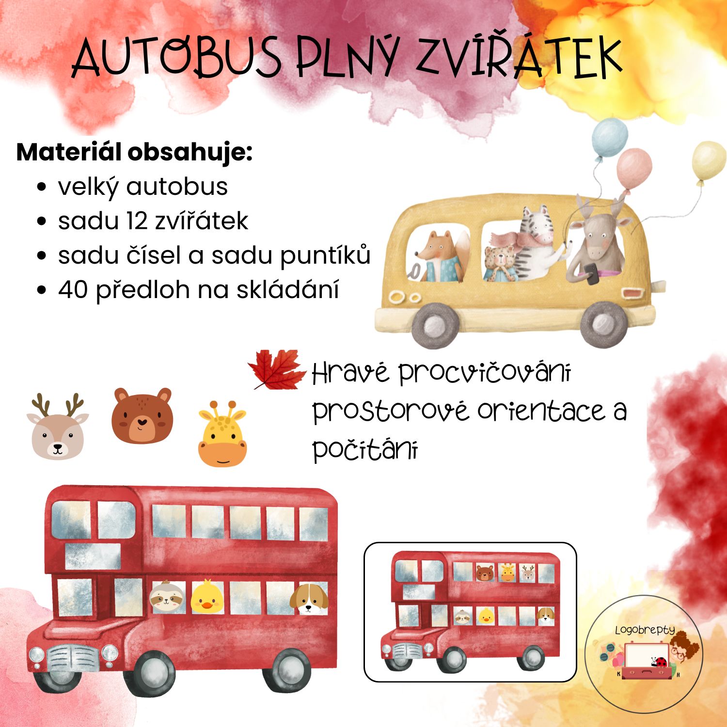 Nasedněte do veselého autobusu plného zvířátek! Děti podle předlohy rozmísťují zvířátka do správných oken dvoupatrového autobusu a poté určují, kolik jich celkem jede na výlet.