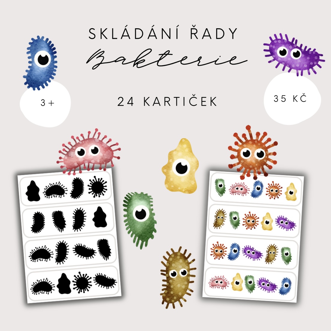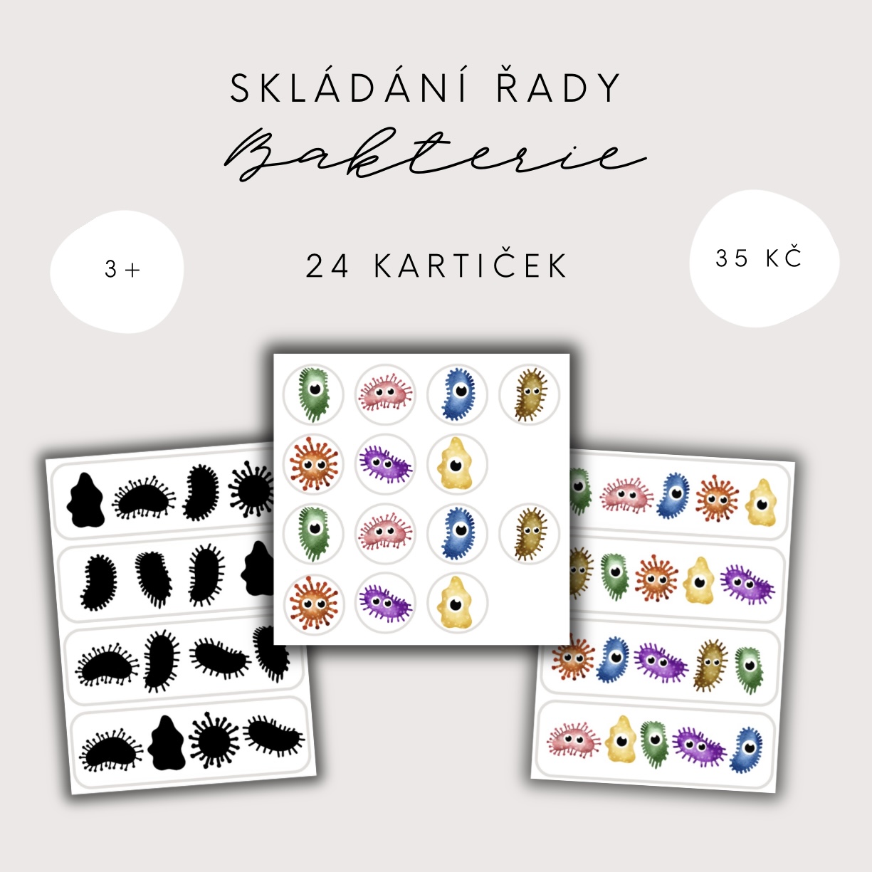 V souboru najdete kolečka s obrázky bakterií a 24 předloh, podle kterých děti skládají správnou řadu.