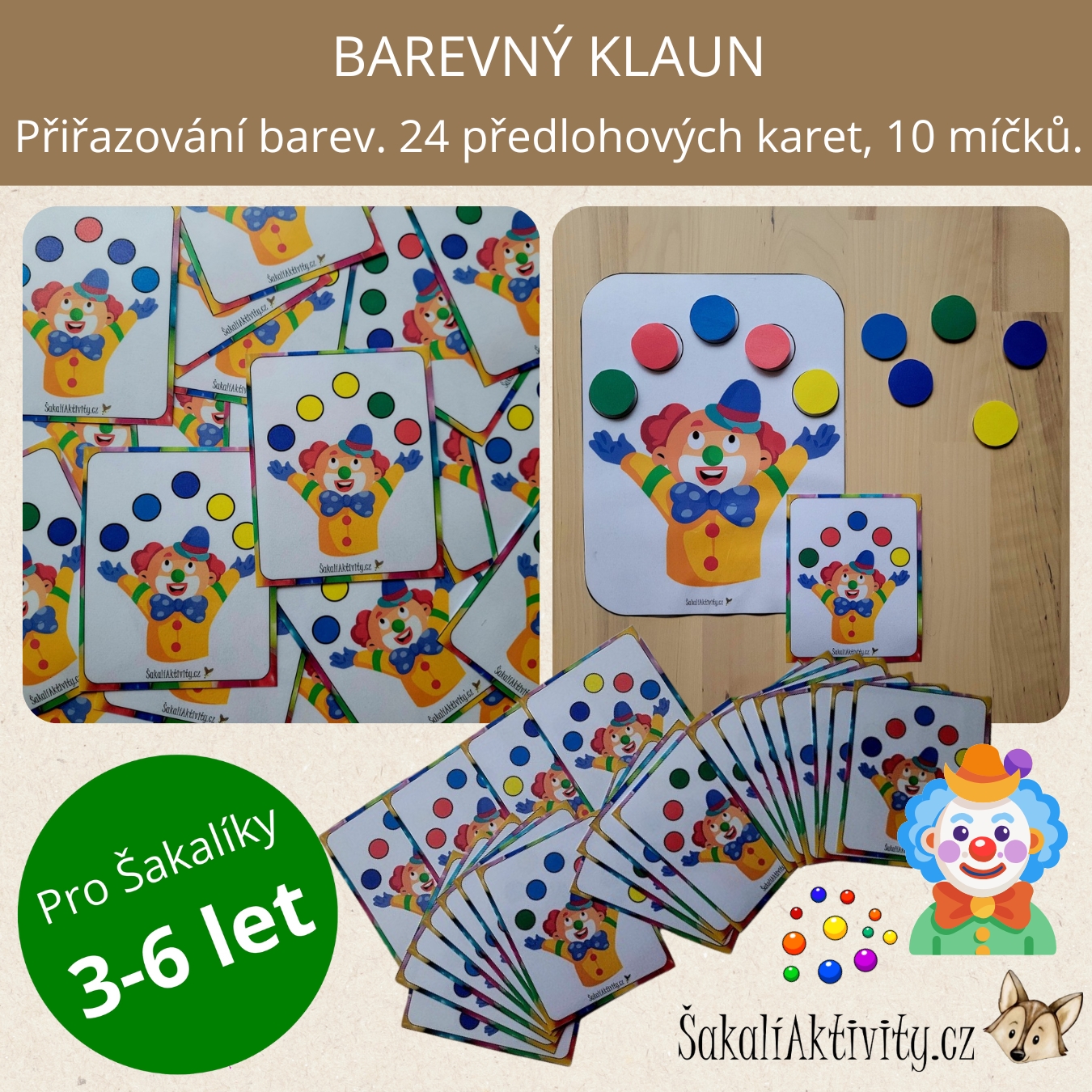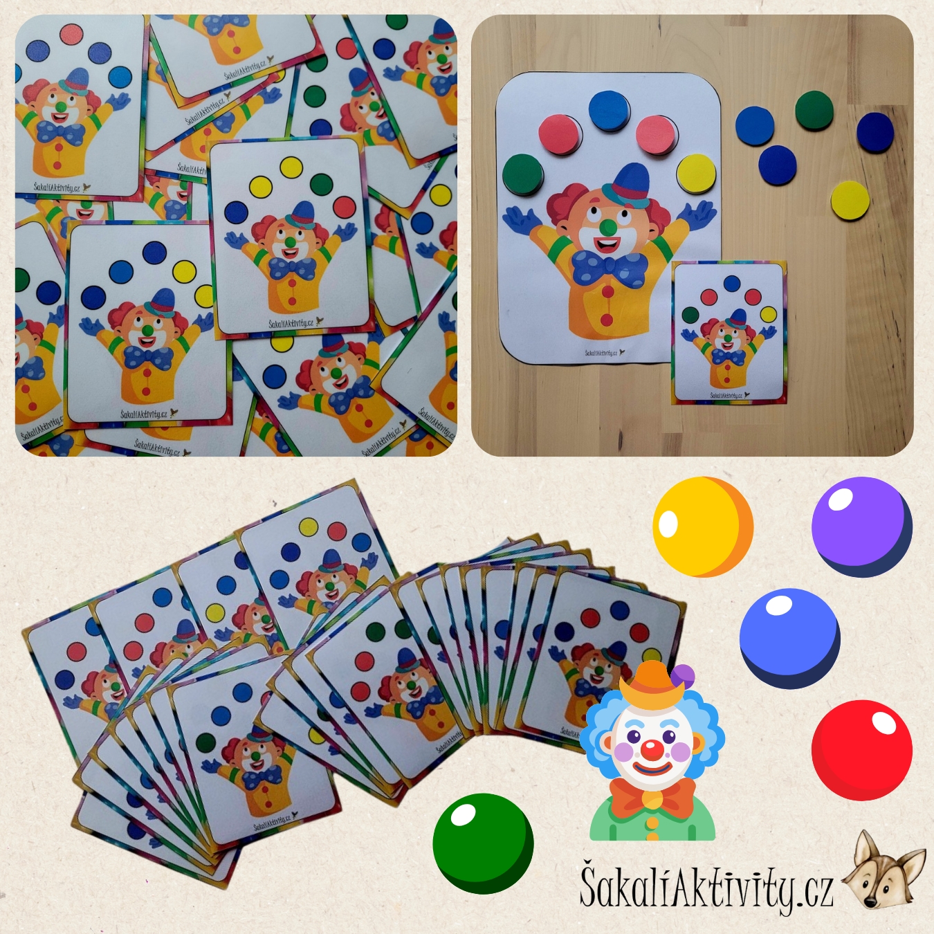 Tato přiřazovací aktivita od ŠakalíAktivity.cz je určena pro děti mladšího školkového a předškolního věku a zaměřuje se na rozvoj zrakového vnímání, prostorové představivosti a jemné motoriky. Děti pracují s podkladovou kartou s obrázkem klauna, který hází míčky, a doplňují do ní barevné míčky podle předlohových kartiček.