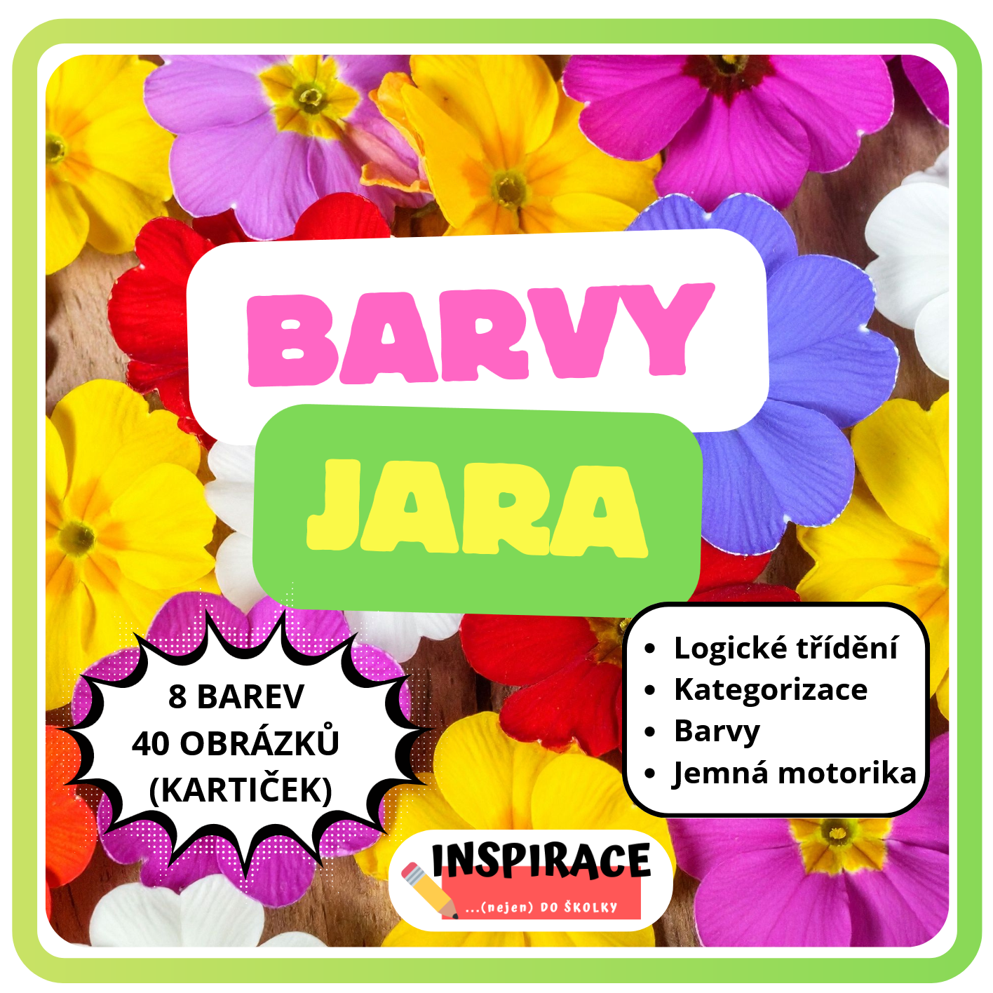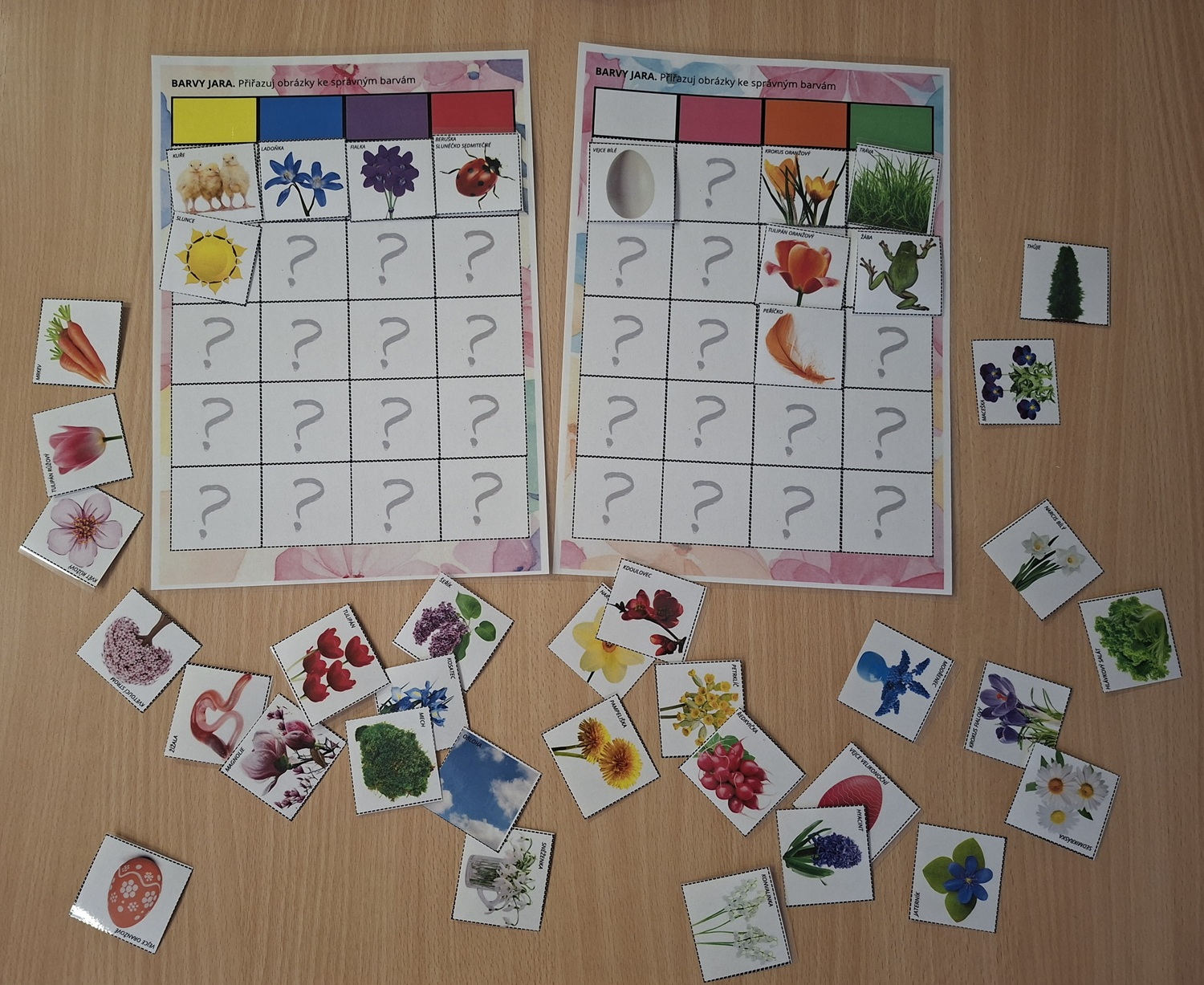 - K jednotlivým barvám přiřazují malé obrázkové kartičky s typickými jarními motivy – žluté květiny, kuřátka, červené tulipány, zelenou žábu, fialku, růžově kvetoucí strom a další symboly probouzejícího se jara.
