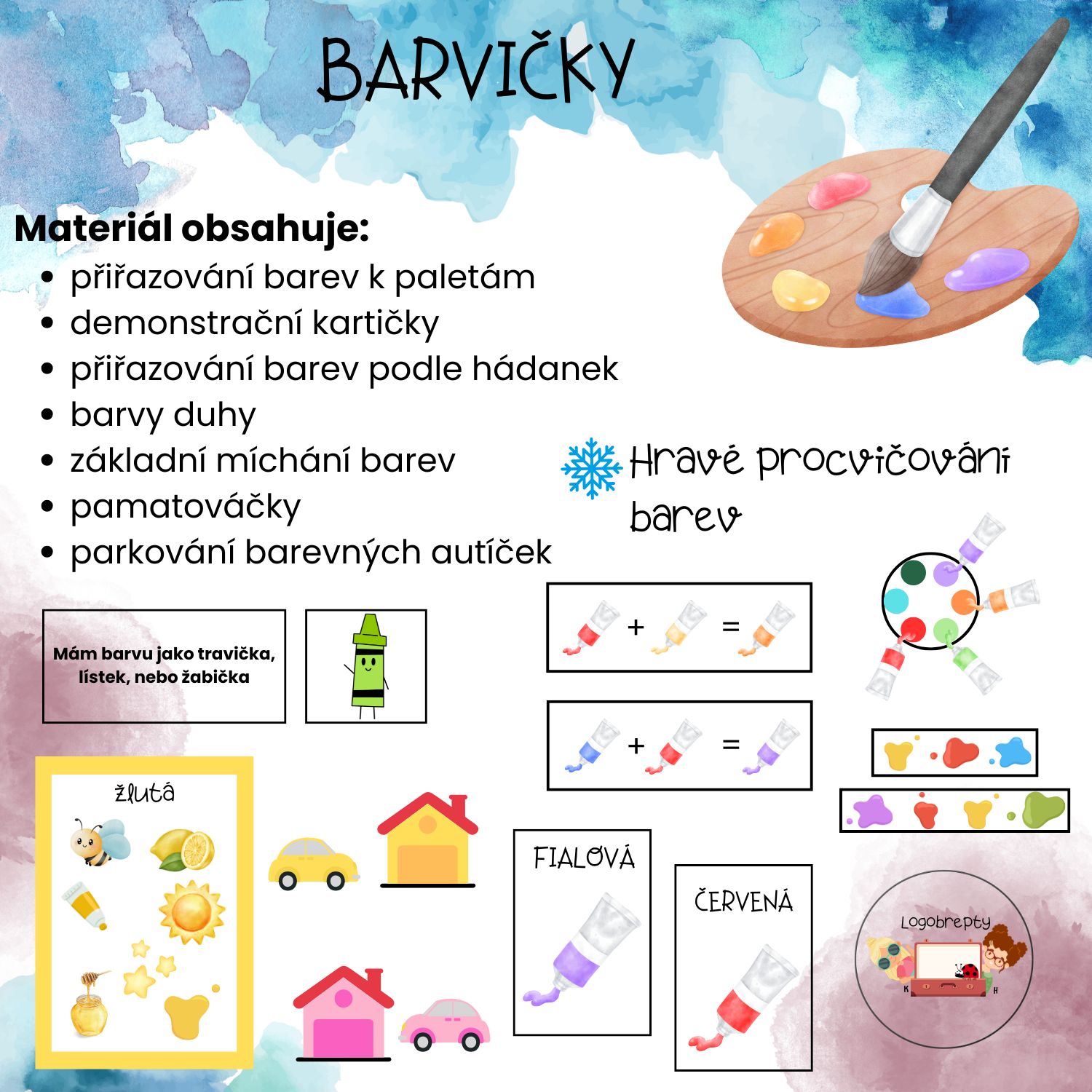 Tento soubor aktivit pomáhá dětem hravou formou objevovat svět barev, rozvíjí zrakové vnímání, paměť, logické myšlení i slovní zásobu. Pomůcka je ideální pro mateřské školy i domácí použití.