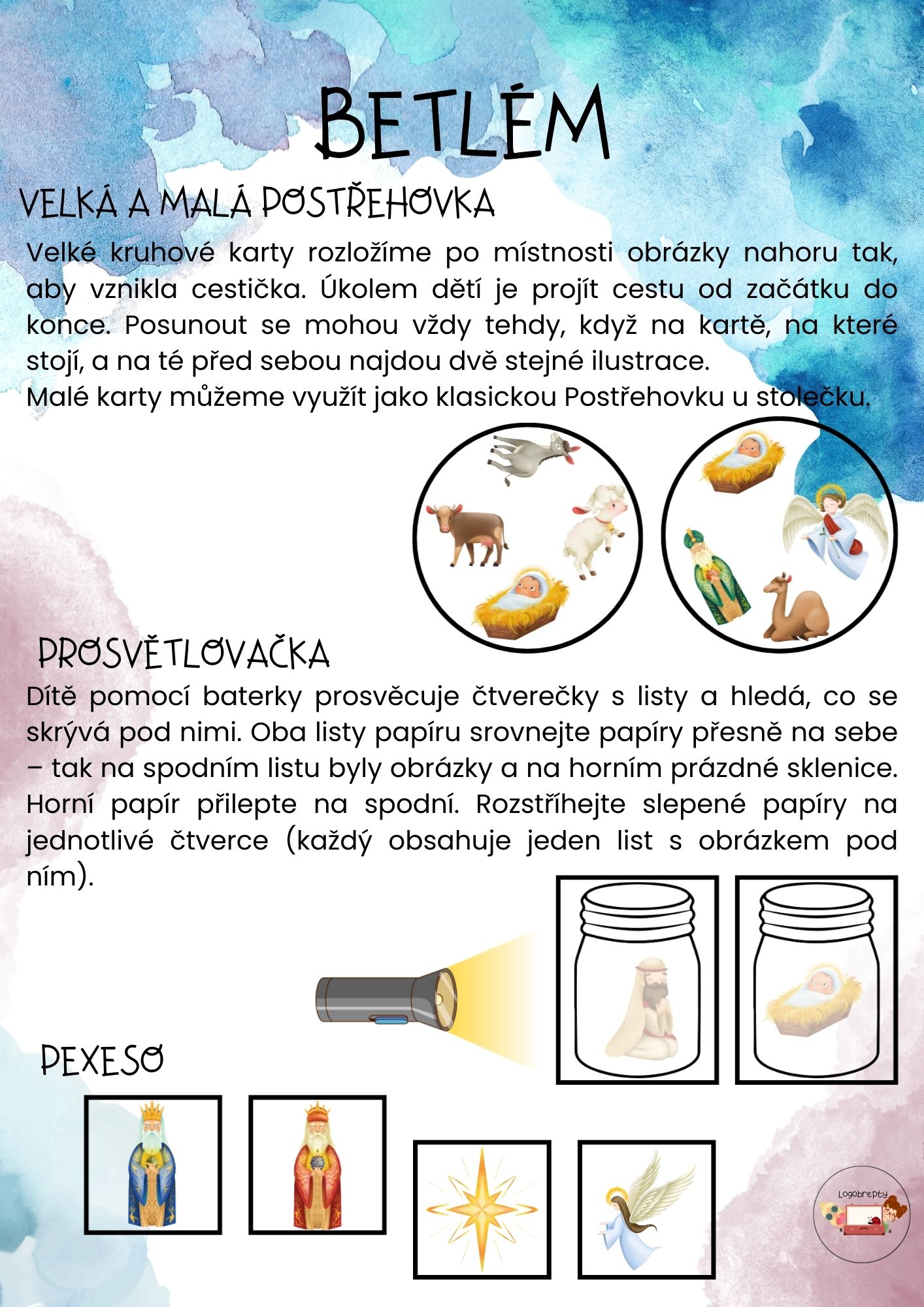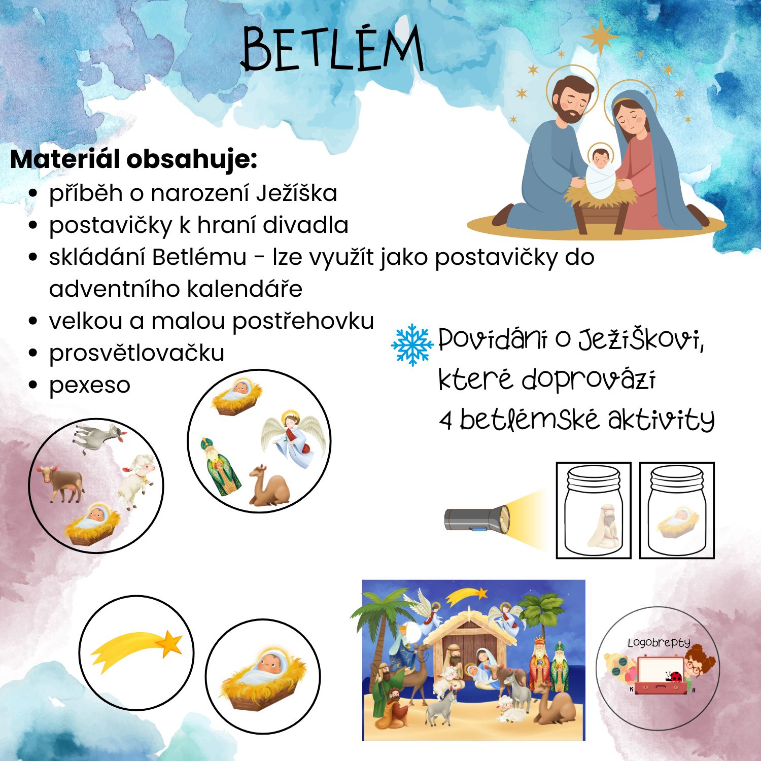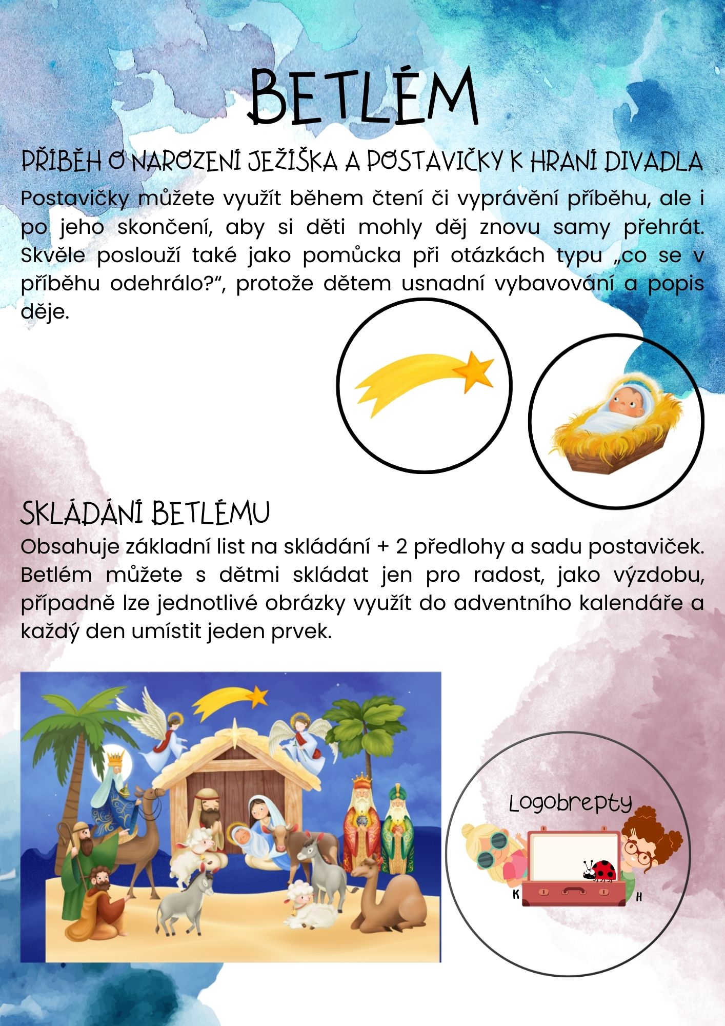 Tento materiál nabízí dětem hravý a poutavý způsob, jak se seznámit s příběhem o narození Ježíška. Najdete v něm sadu postaviček pro jednoduché divadlo, skládací Betlém (vhodný i jako postupné doplňování do adventního kalendáře), velkou i malou postřehovou hru, prosvětlovačku a pexeso.