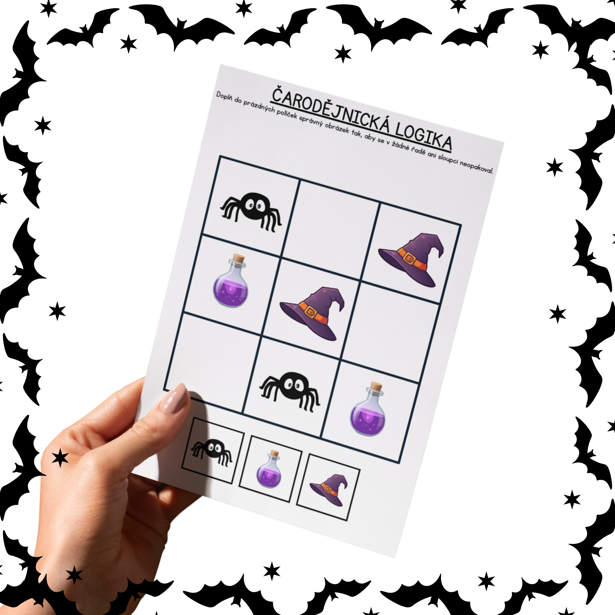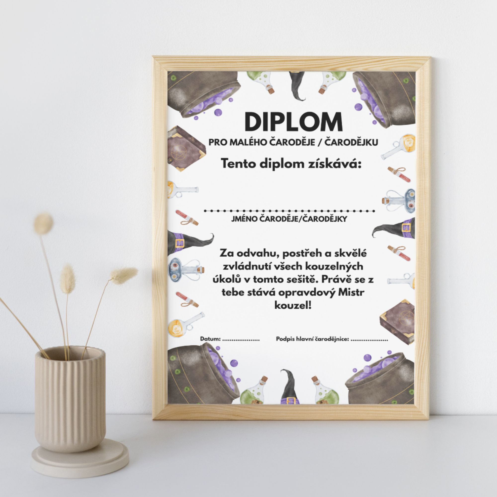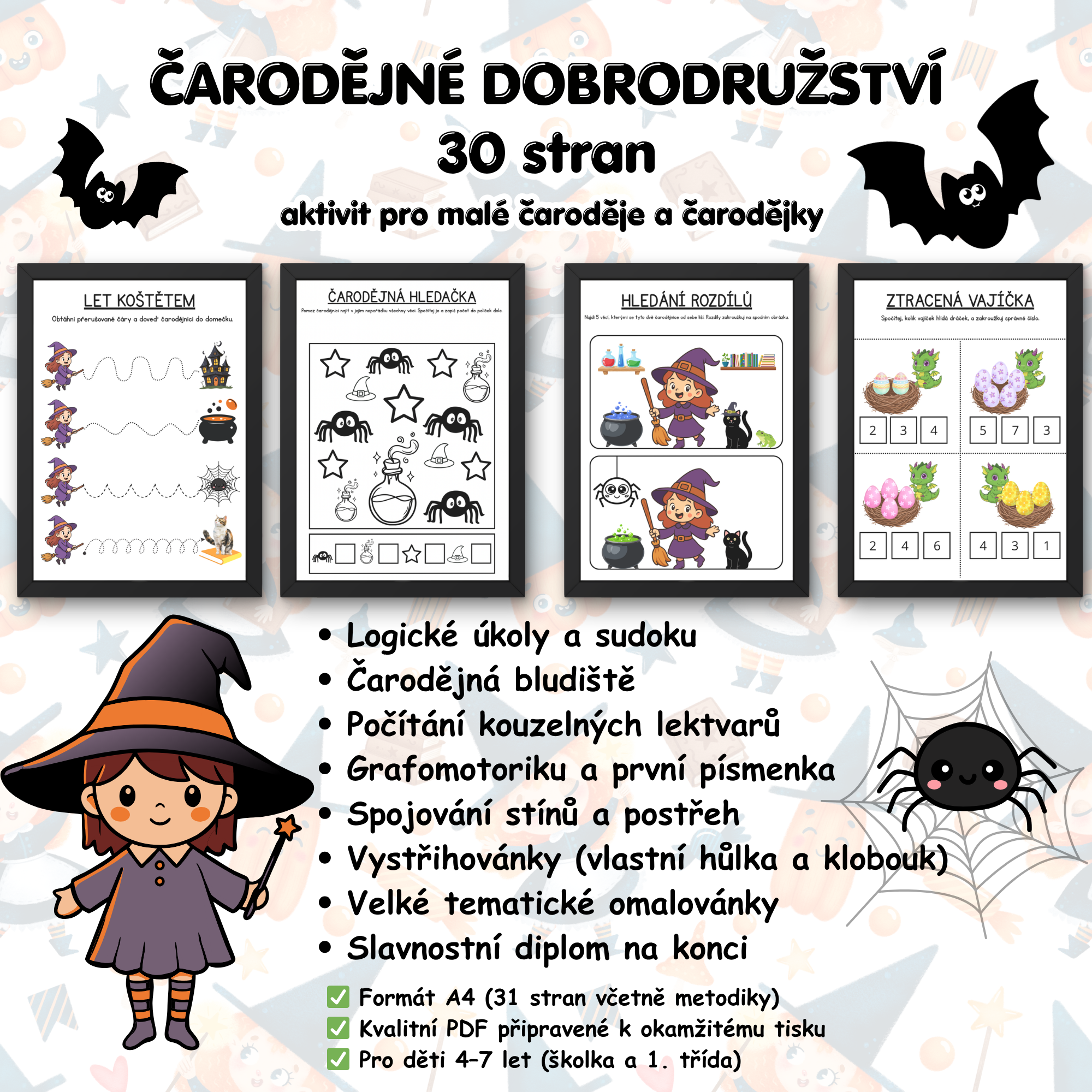 Soubor 30 zábavných pracovních listů s čarodějnickou tematikou pro děti ve věku 4–7 let. Materiál obsahuje bludiště, hledání rozdílů, logické úkoly, počítání kouzelných lektvarů, grafomotorická cvičení, spojování stínů, vystřihovánky i tematické omalovánky. Na konci děti čeká slavnostní diplom pro malé čaroděje a čarodějky. PDF je připravené k okamžitému tisku ve formátu A4.