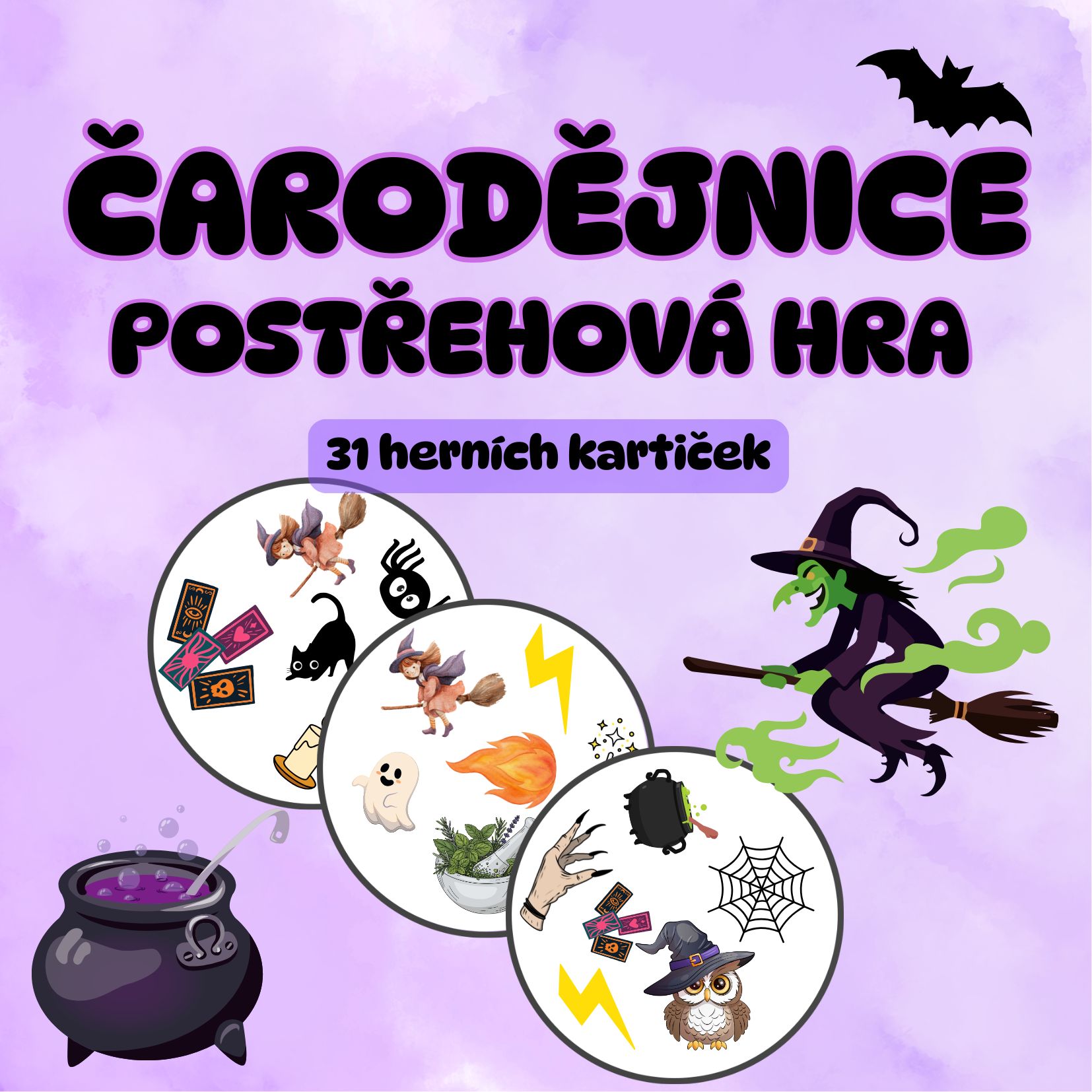 - 31 herních kartiček s unikátními čarodějnickými symboly.