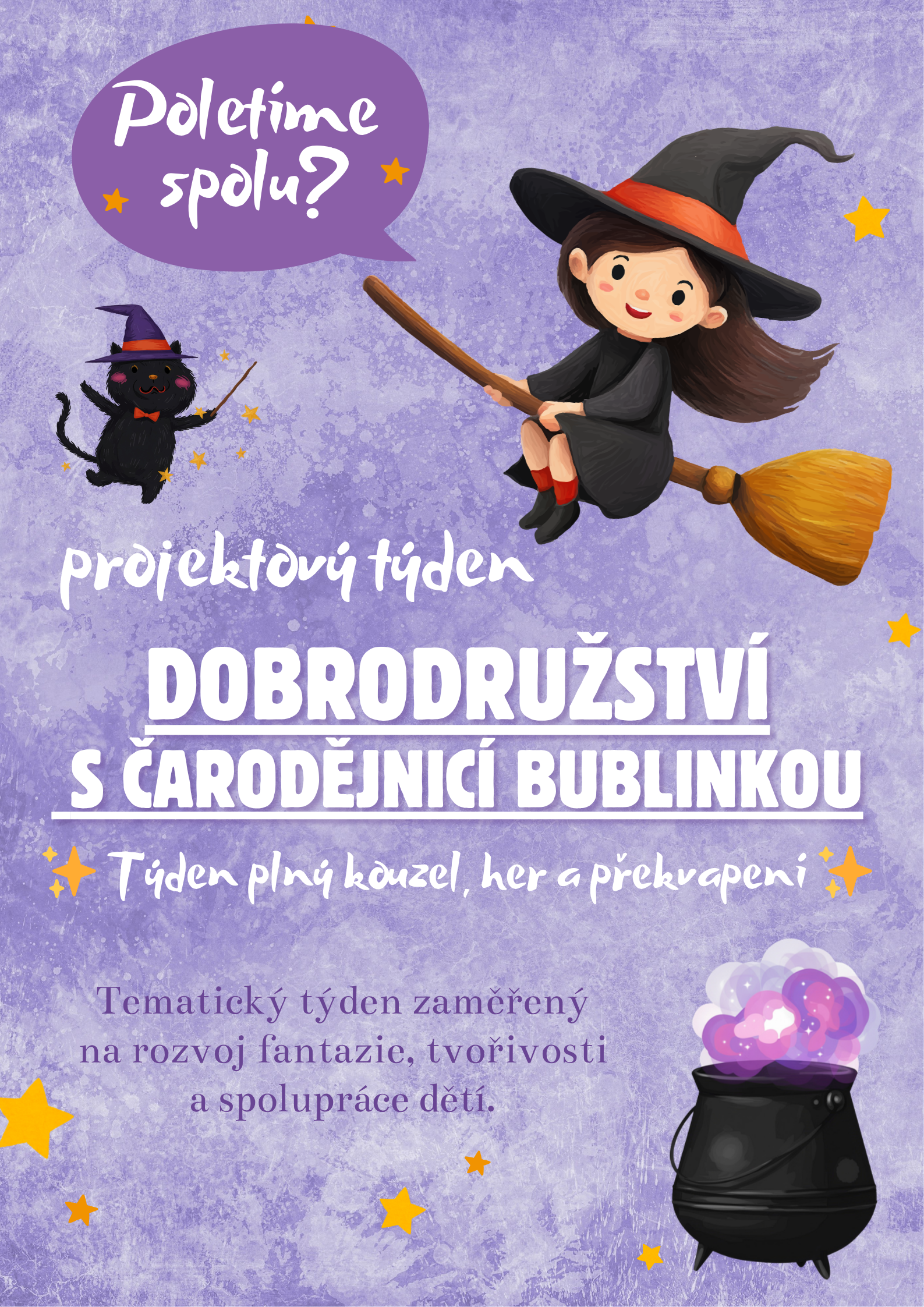 Děti po celý týden provází hodná čarodějnice Bublinka, která jim pomocí příběhů, dopisů a zábavných úkolů představuje čarodějnický svět. Společně budou míchat lektvary, vyrábět kouzelné pomůcky, hrát tematické hry a plnit úkoly vedoucí k závěrečnému čarodějnickému reji.