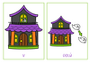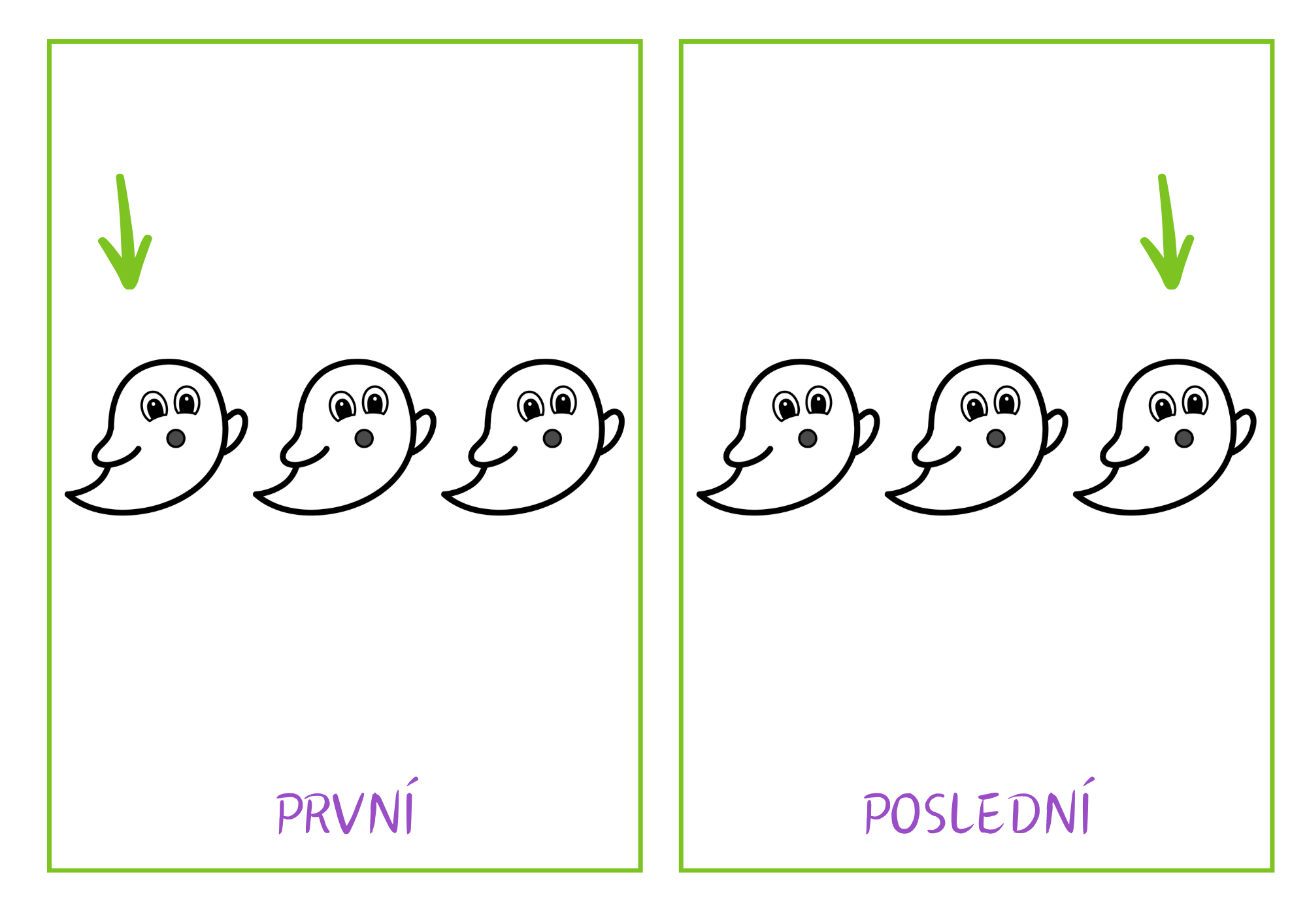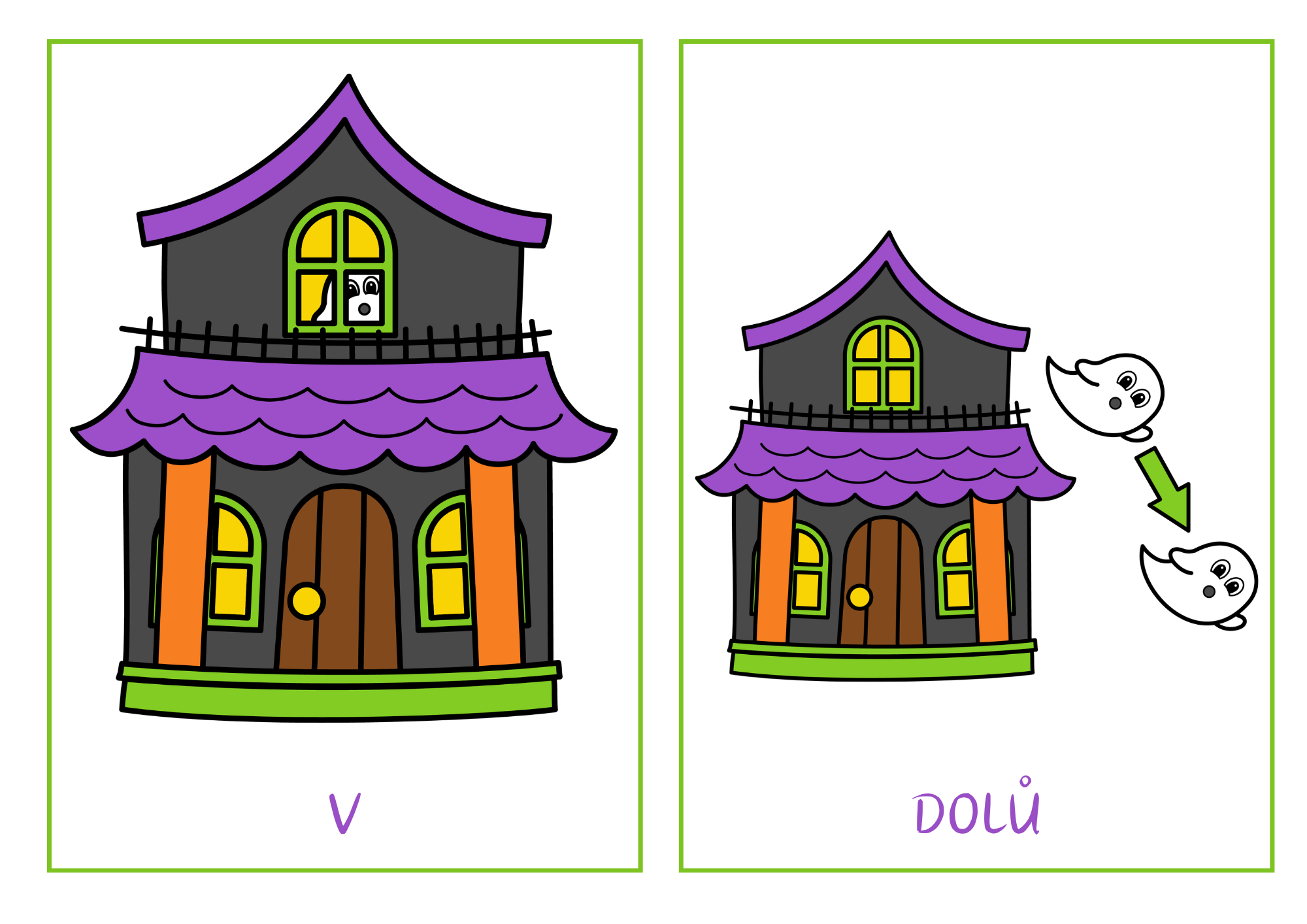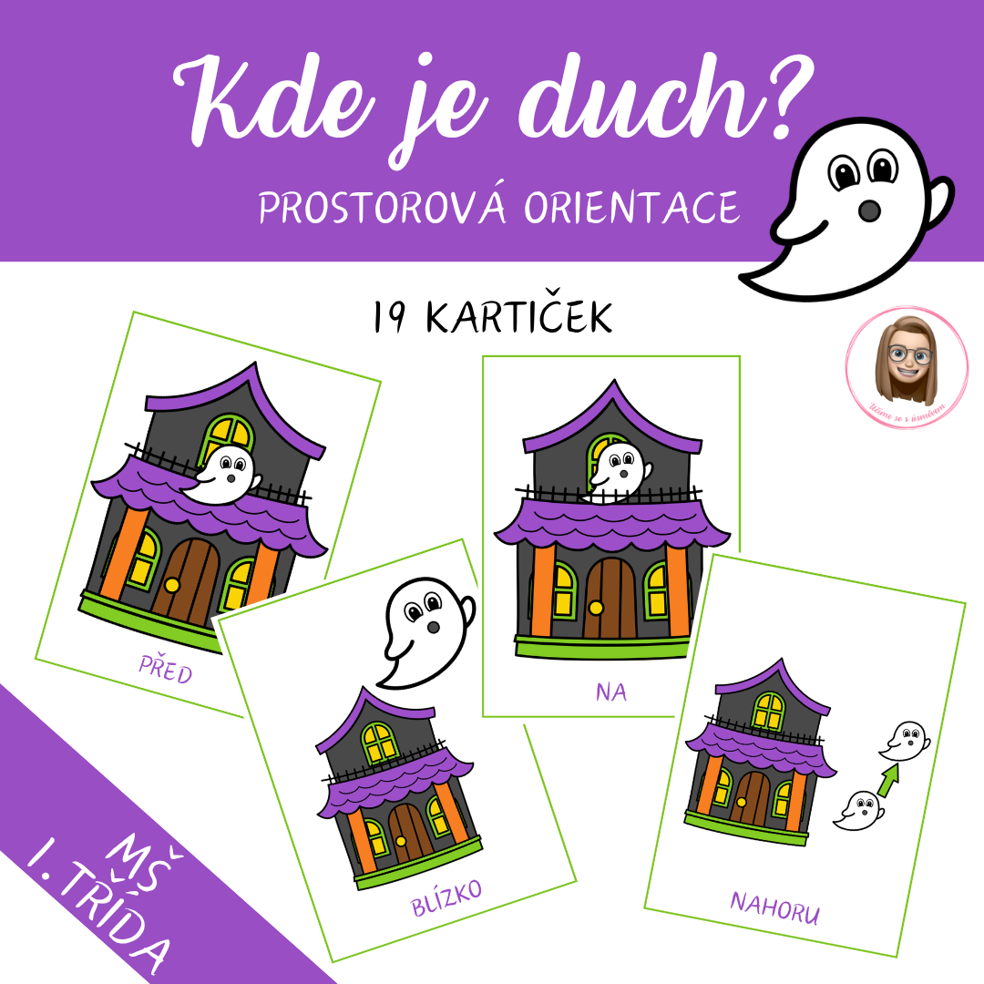 Děti pracují s obrázkovými kartičkami, na kterých popisují polohu ducha vůči domu a upevňují si základní prostorové pojmy.
