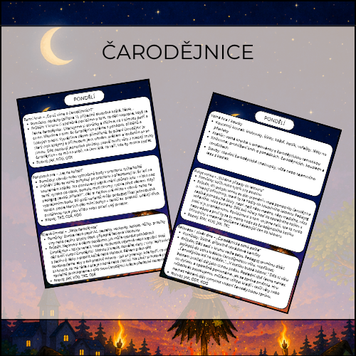 Týdenní tematická příprava „Čarodějnice“ vede děti k poznávání této oblíbené jarní tradice hravou, smysluplnou a přiměřenou formou. Děti se během týdne seznamují s tím, co k čarodějnicím patří – s kouzelnou nocí, ohněm, koštětem, kotlíkem, bylinkami i pohádkovou postavou čarodějnice. Celé téma je zpracované tak, aby nevyvolávalo strach, ale naopak podporovalo fantazii, tvořivost, slovní zásobu, smyslové vnímání i radost ze společných aktivit. Nechybí pohybové hry, badatelské a smyslové činnosti, společné tvoření, práce s příběhem, venkovní aktivity ani klidné závěrečné opakování celého týdne.