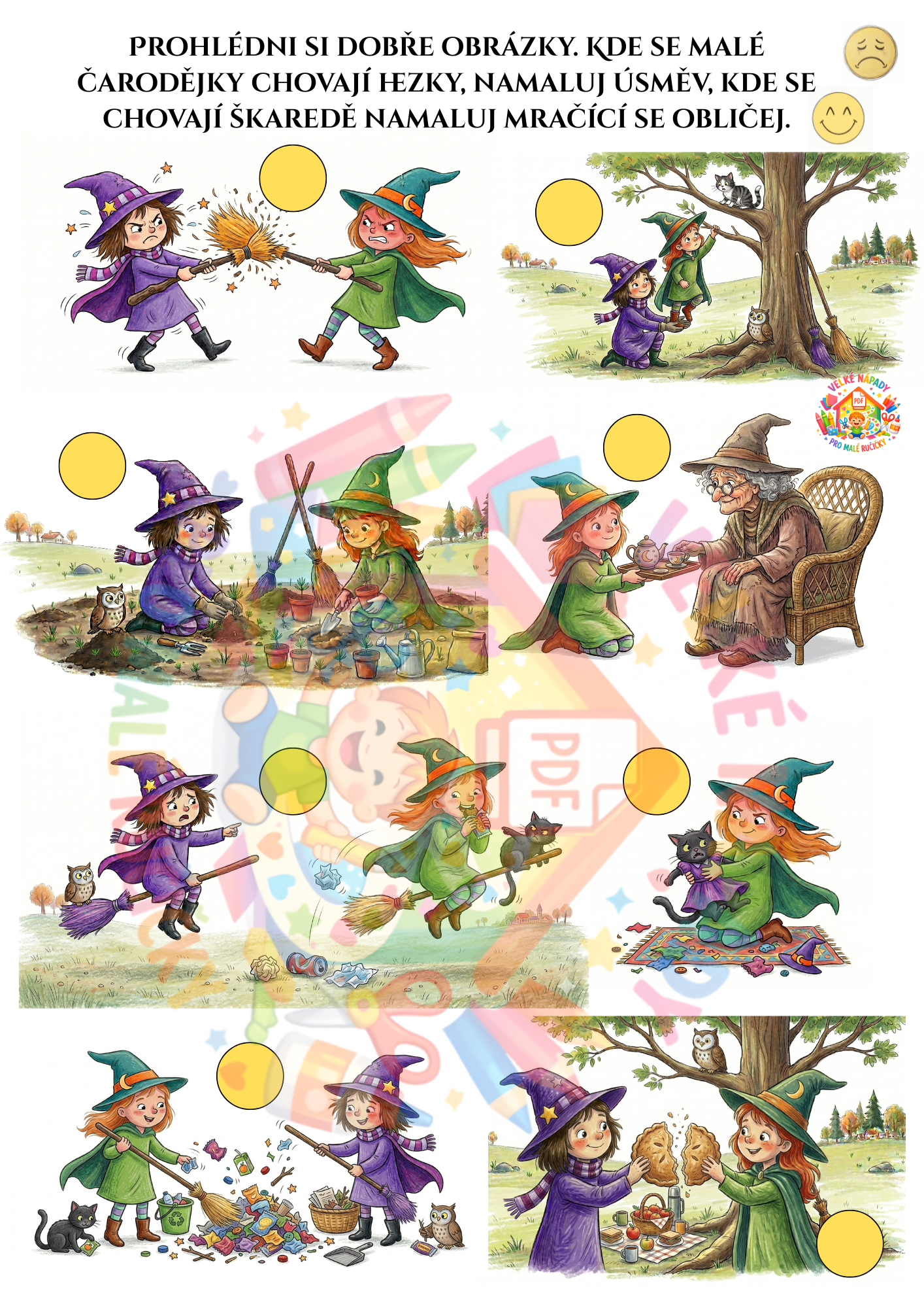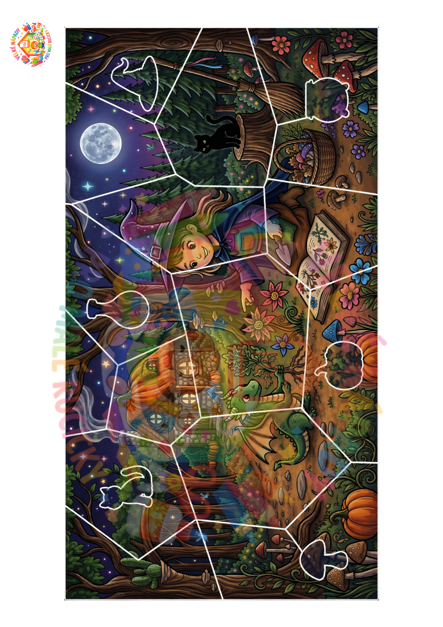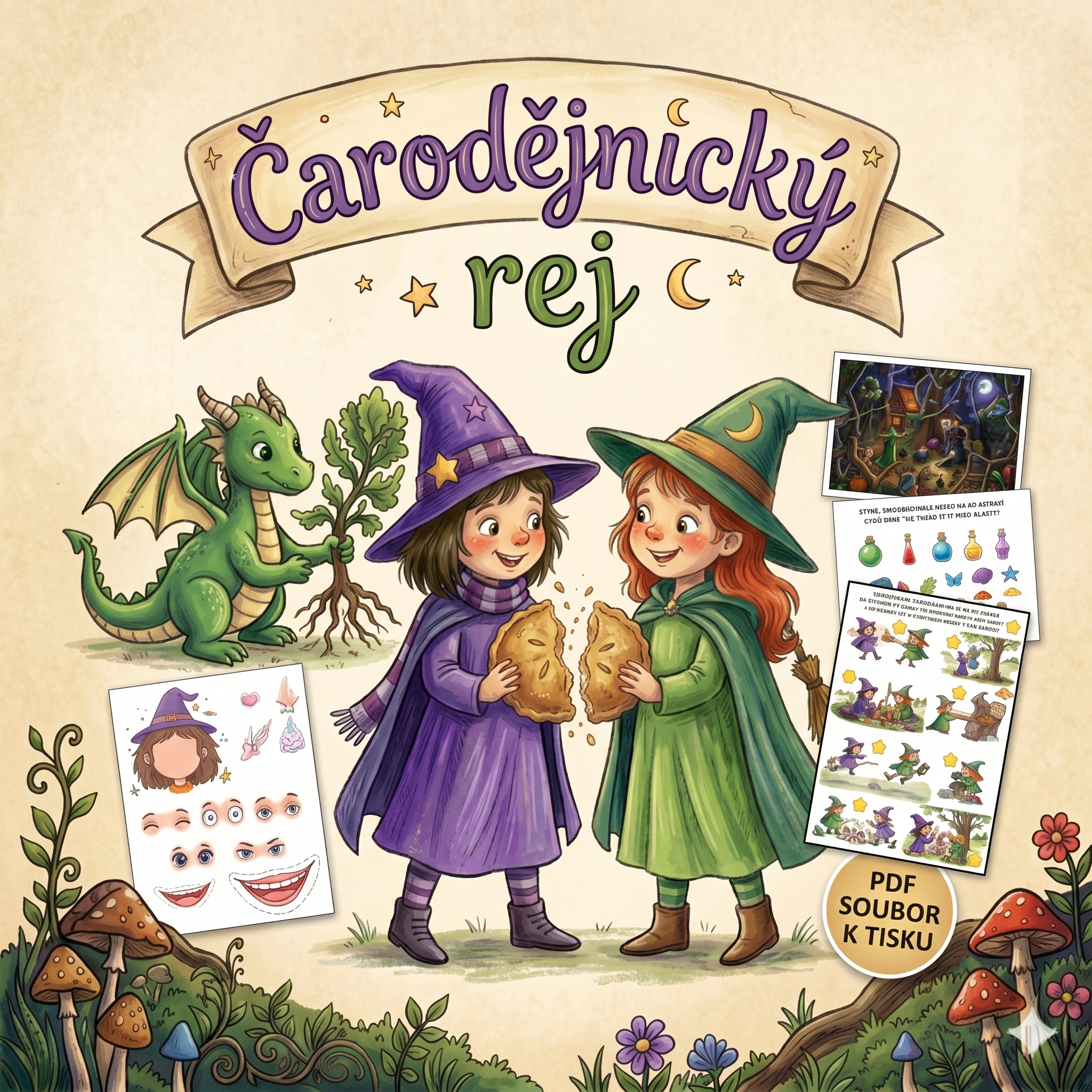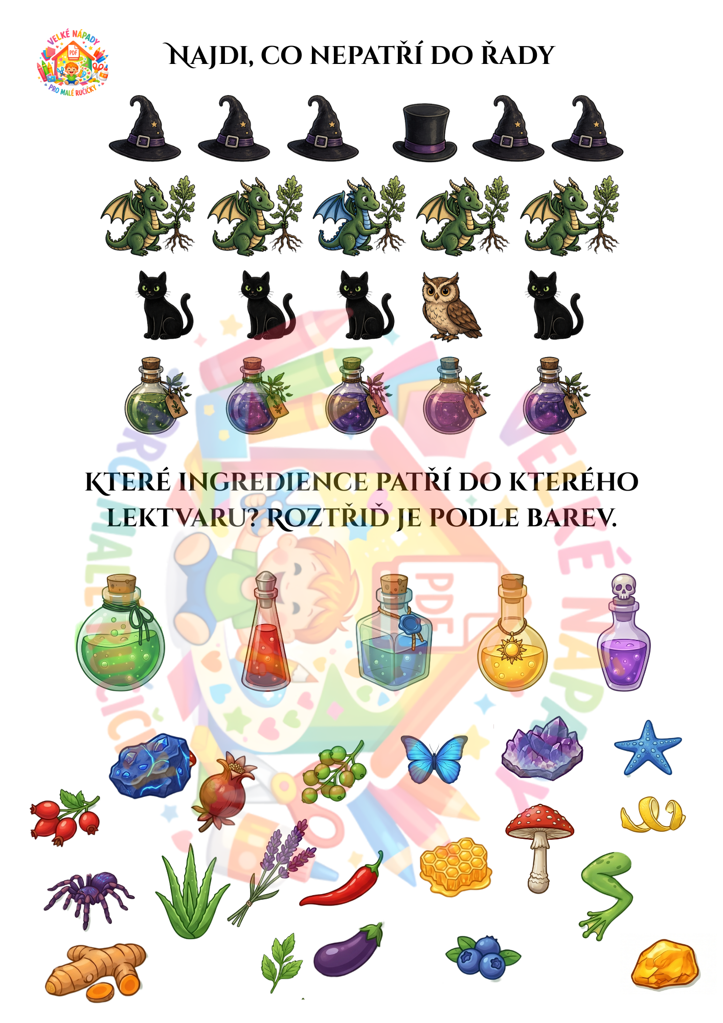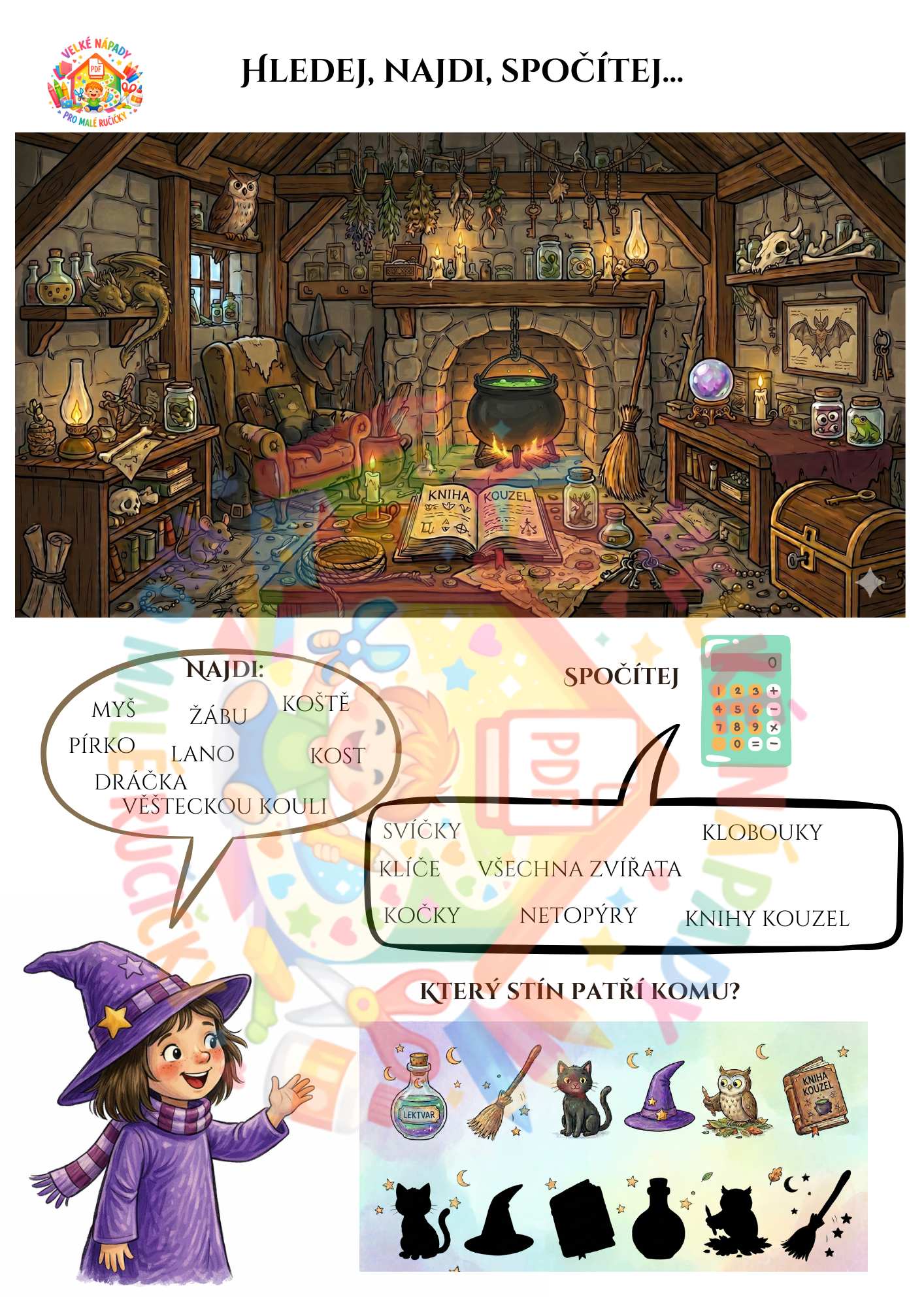 Co všechno v materiálu najdete? 🧩 Puzzle pro malé objevitele 🎨 Omalovánku pro kreativní chvilky 🌈 Třídění podle barev (lektvary a přísady) 🔍 Hledání v obrázku – procvičte si postřeh! 🔢 Počítání s čarodějnou tematikou 👤 Hledání stínů – poznáš, komu patří? 🎭 Tvoření čarodějky – poskládejte si vlastní tvář díky sadě očí, nosů a pusinek!
