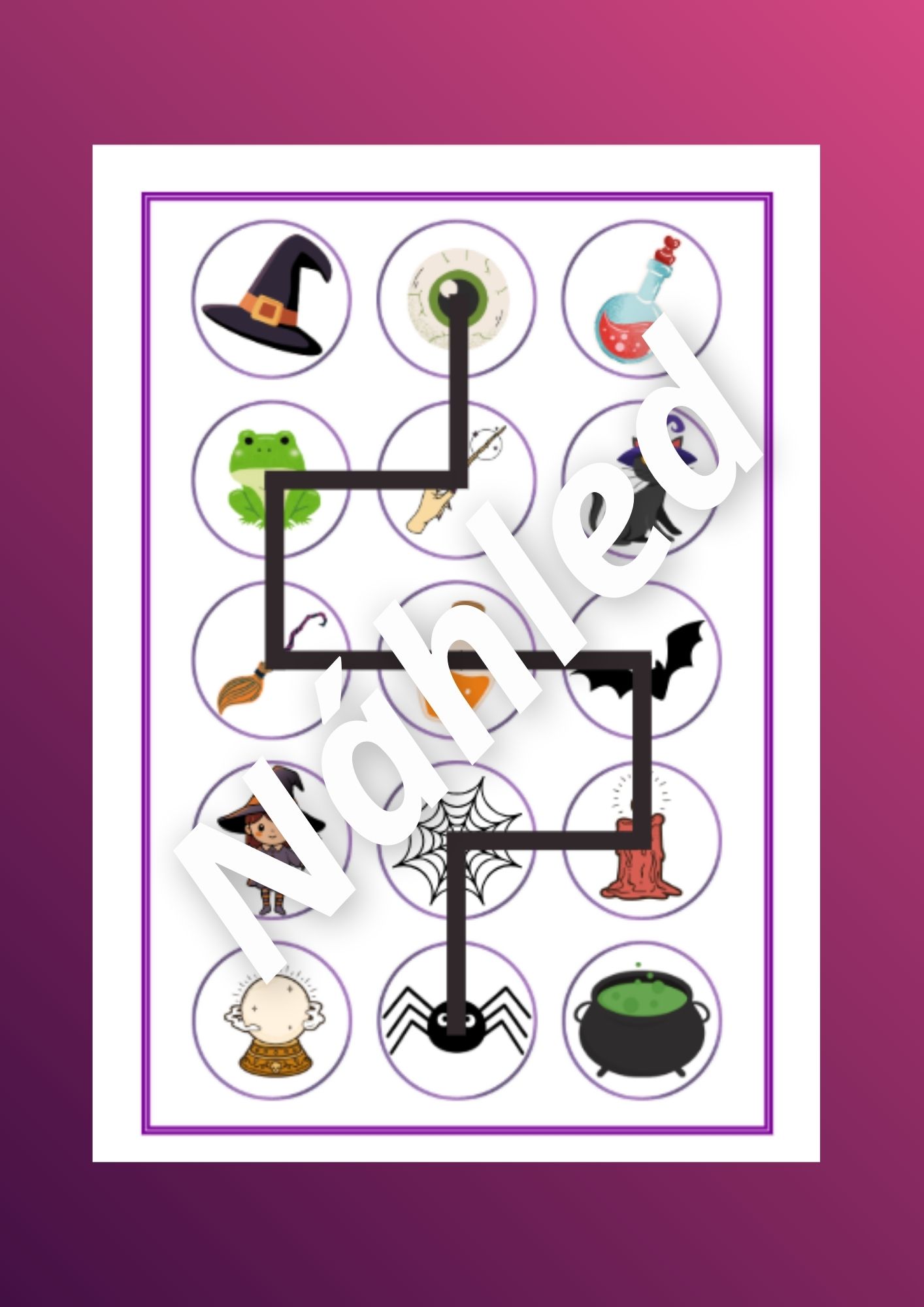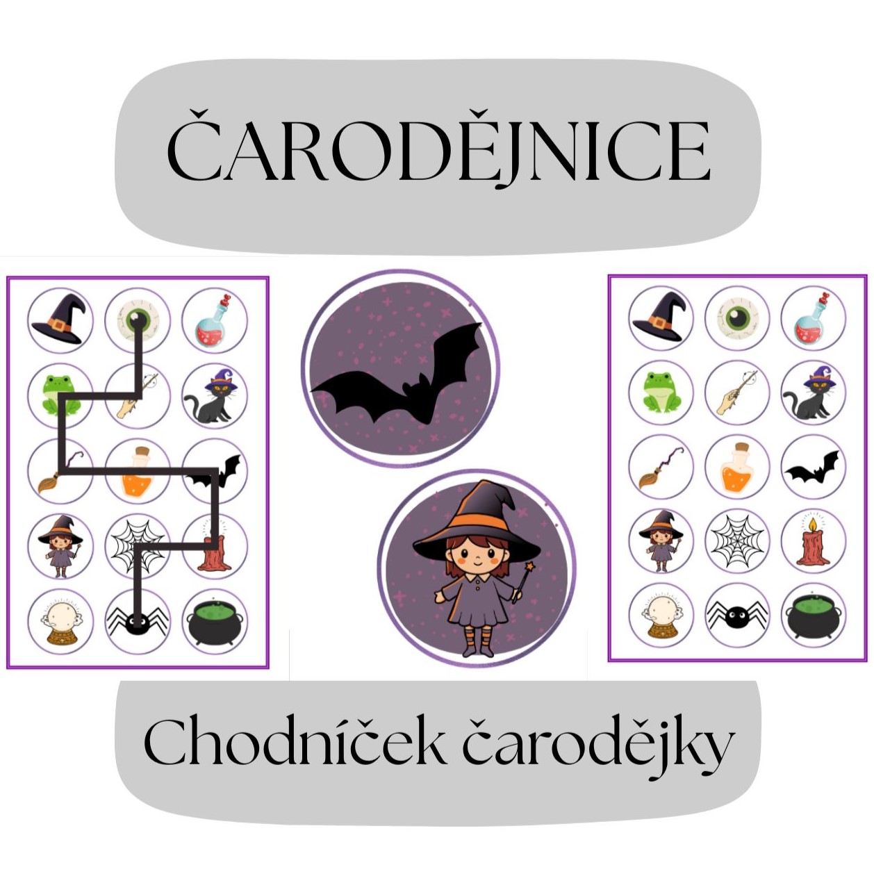 - Chodníček čarodějky - dítě má v ruce mapu bludiště a musí pomocí ní projít správnými obrázky, kterými vede trasa