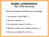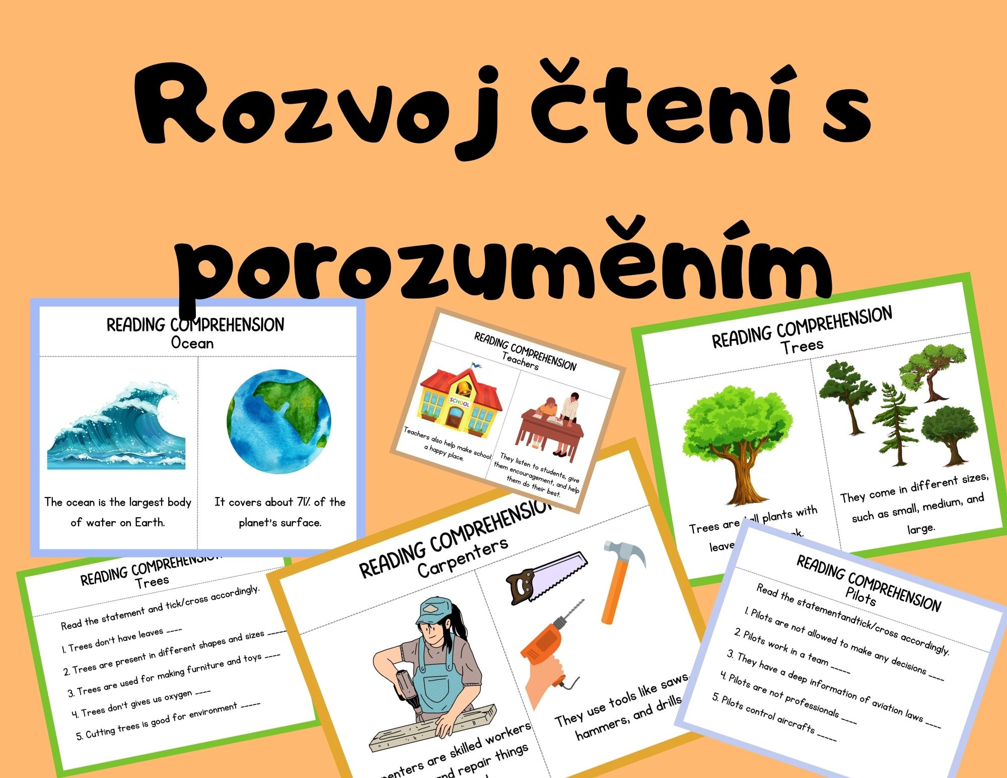 Rozvoj čtení s porozuměním a základních znalostí u dětí. Každé téma (sněhulák, auto, kočka, pes, jablka, ptáci, duha, oceán) obsahuje krátký ilustrovaný text, po kterém následují kontrolní otázky a cvičení typu pravda/nepravda.