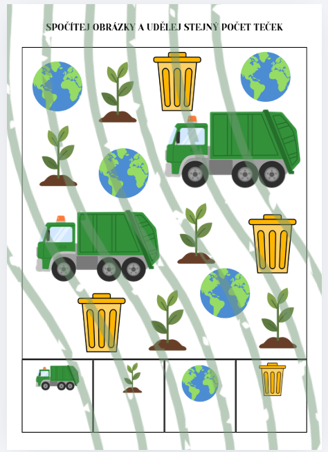 Materiál „Pracovní listy – Den Země“ je vzdělávací soubor určený pro děti v mateřské škole, který podporuje rozvoj grafomotoriky, logického myšlení, zrakového vnímání a základního ekologického povědomí. Obsahuje pestrou škálu aktivit, jako je obkreslování tvarů, bludiště, spojování obrázků, třídění odpadu, hledání stínů, počítání, práce s barvami či určování, co do řady nepatří. Jednotlivé pracovní listy mají různou úroveň obtížnosti, díky čemuž jsou vhodné pro všechny věkové kategorie předškolního vzdělávání – od mladších dětí po starší předškoláky. Materiál podporuje samostatnost, soustředění i hravou formu učení a lze jej využít jak při řízených činnostech, tak při individuální práci dětí.