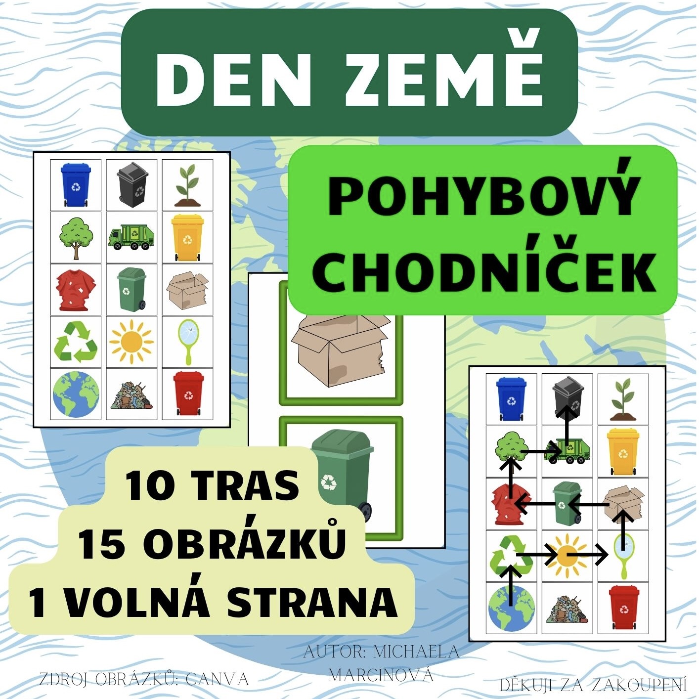 - 15 velkých čtverců s obrázky (např. strom, třídicí kontejnery, planeta Země, sluníčko).