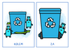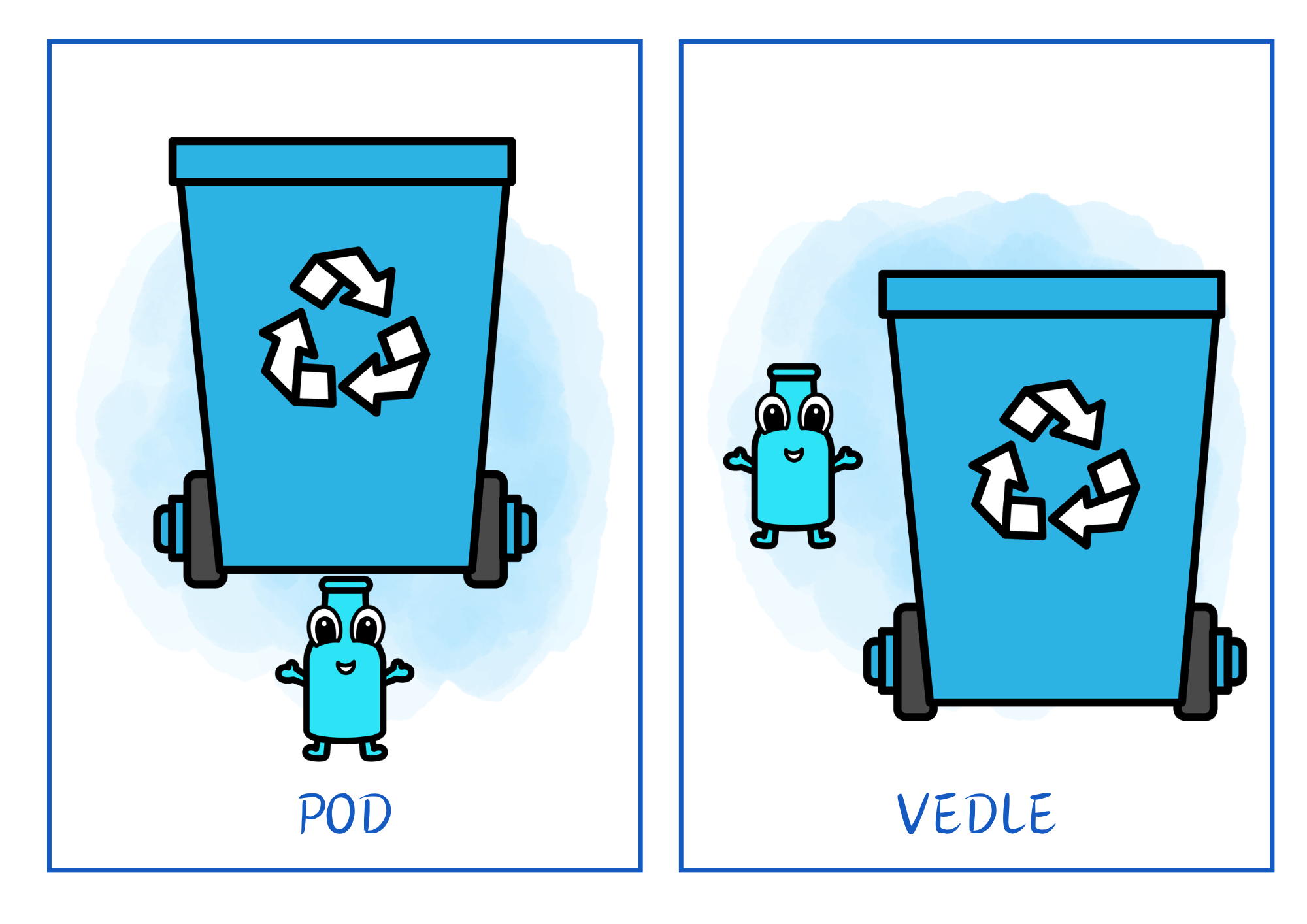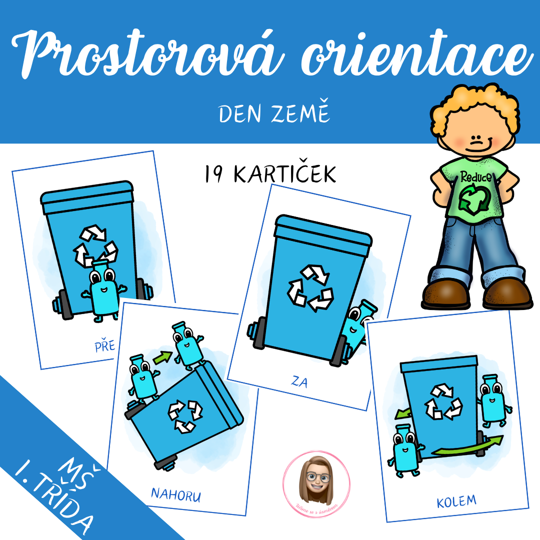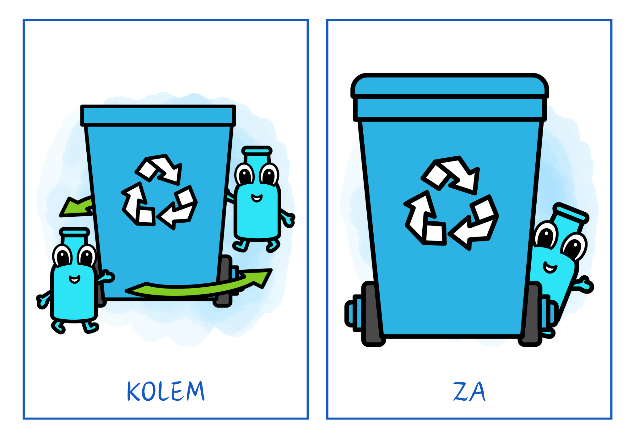 Děti pracují s obrázkovými kartičkami, na kterých popisují polohu láhve vůči popelnici a upevňují si základní prostorové pojmy.