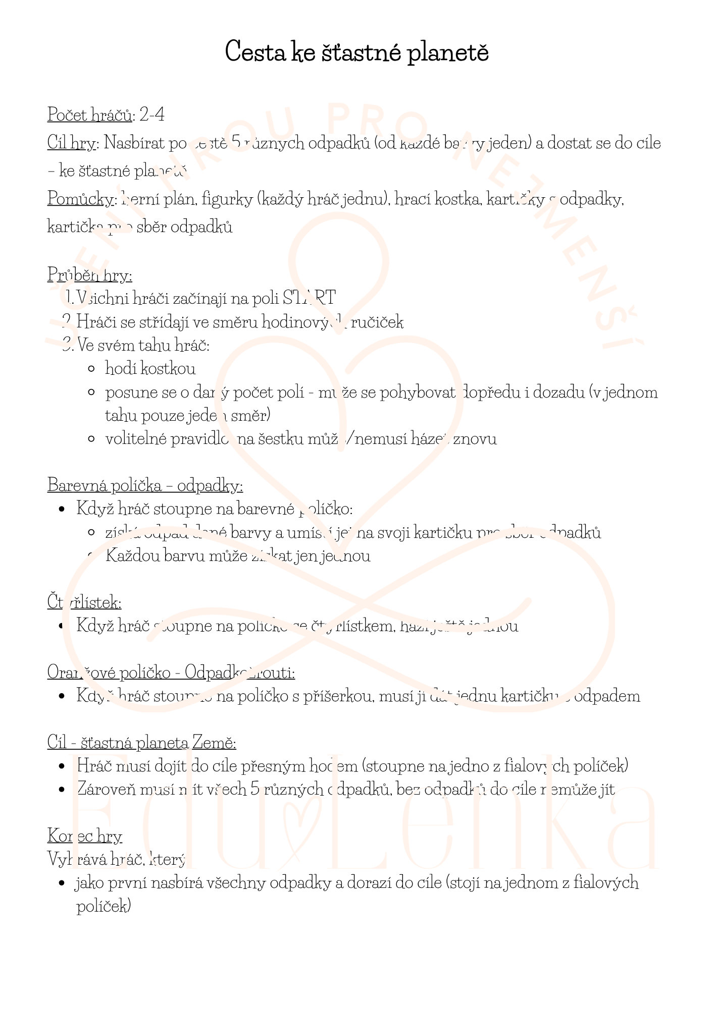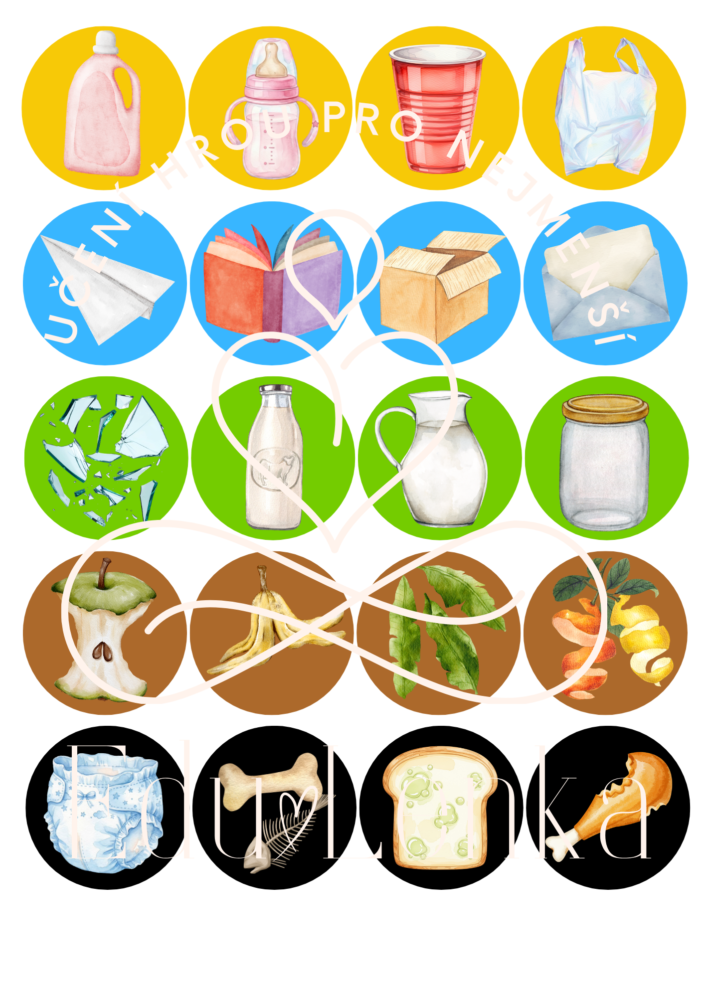Pomůcky: herní plán, figurky (každý hráč jednu), hrací kostka, kartičky s odpadky, kartička pro sběr odpadků