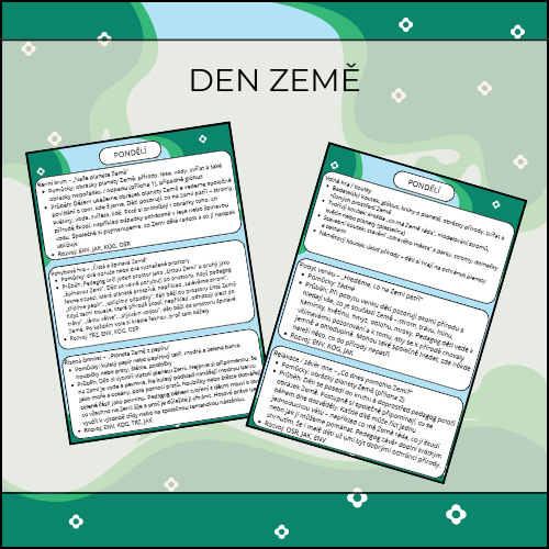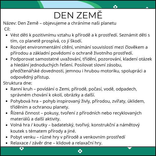 Týdenní tematická příprava „Den Země“ vede děti k tomu, aby poznávaly naši planetu jako místo, o které je potřeba pečovat. Děti se během týdne seznamují s tím, co Zemi prospívá a co jí naopak škodí, učí se všímat si přírody kolem sebe, třídit odpad, přemýšlet o vodě, růstu rostlin i o tom, jak mohou samy pomáhat svému okolí. Téma je zpracované prostřednictvím pohybu, pokusů, tvoření, pozorování i praktických činností, které dětem dávají smysl a vedou je k ohleduplnosti, zodpovědnosti a vnímání světa kolem nás.
