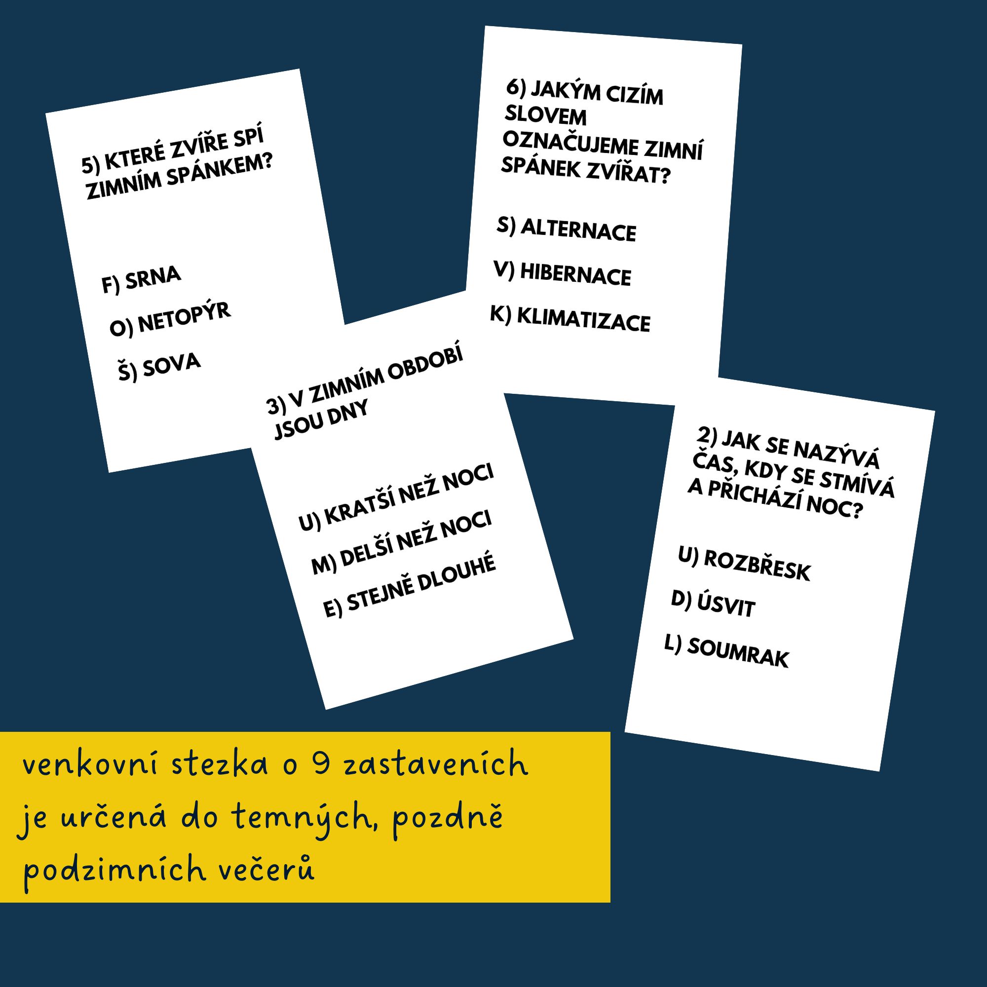 Aktivitu můžete využít k povídání o rytmu roku a roli světla a tmy v přírodě. Listy mají záměrně jednoduchou grafiku i písmo, aby byly pro děti ve tmě opravdu dobře čitelné.