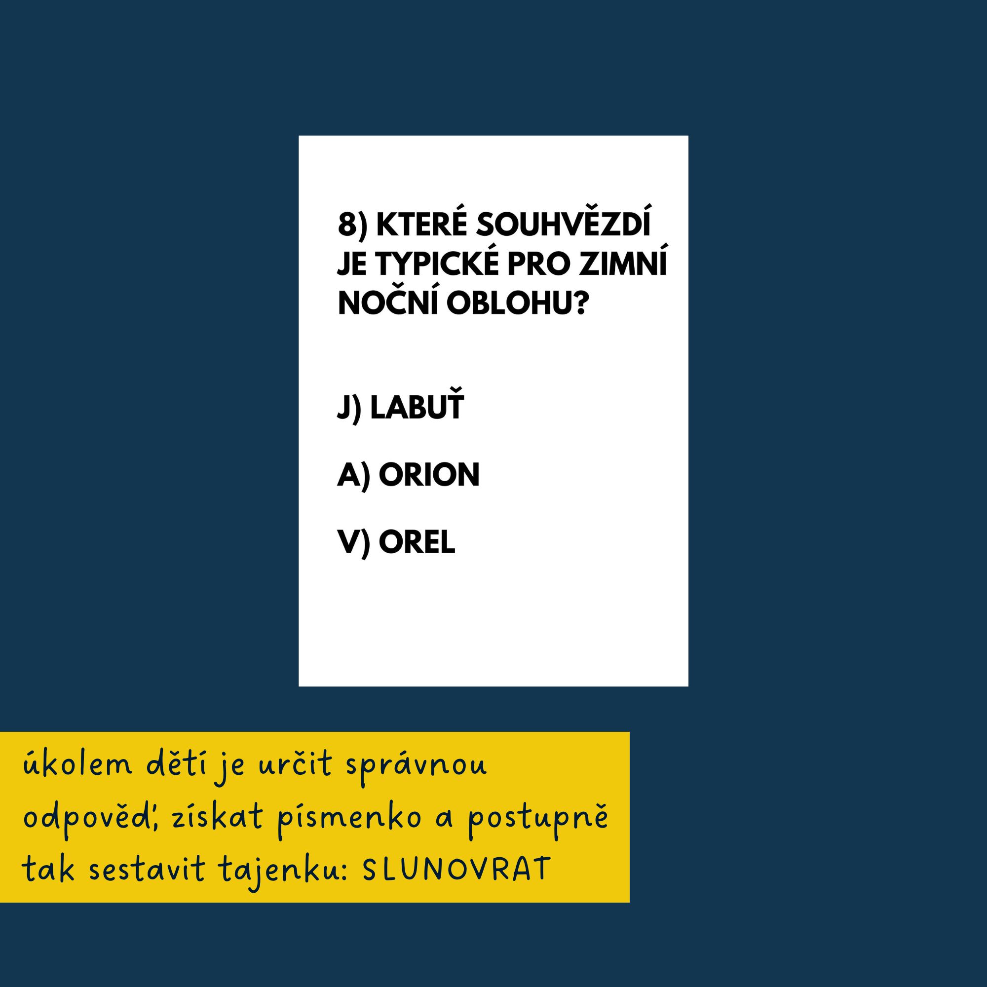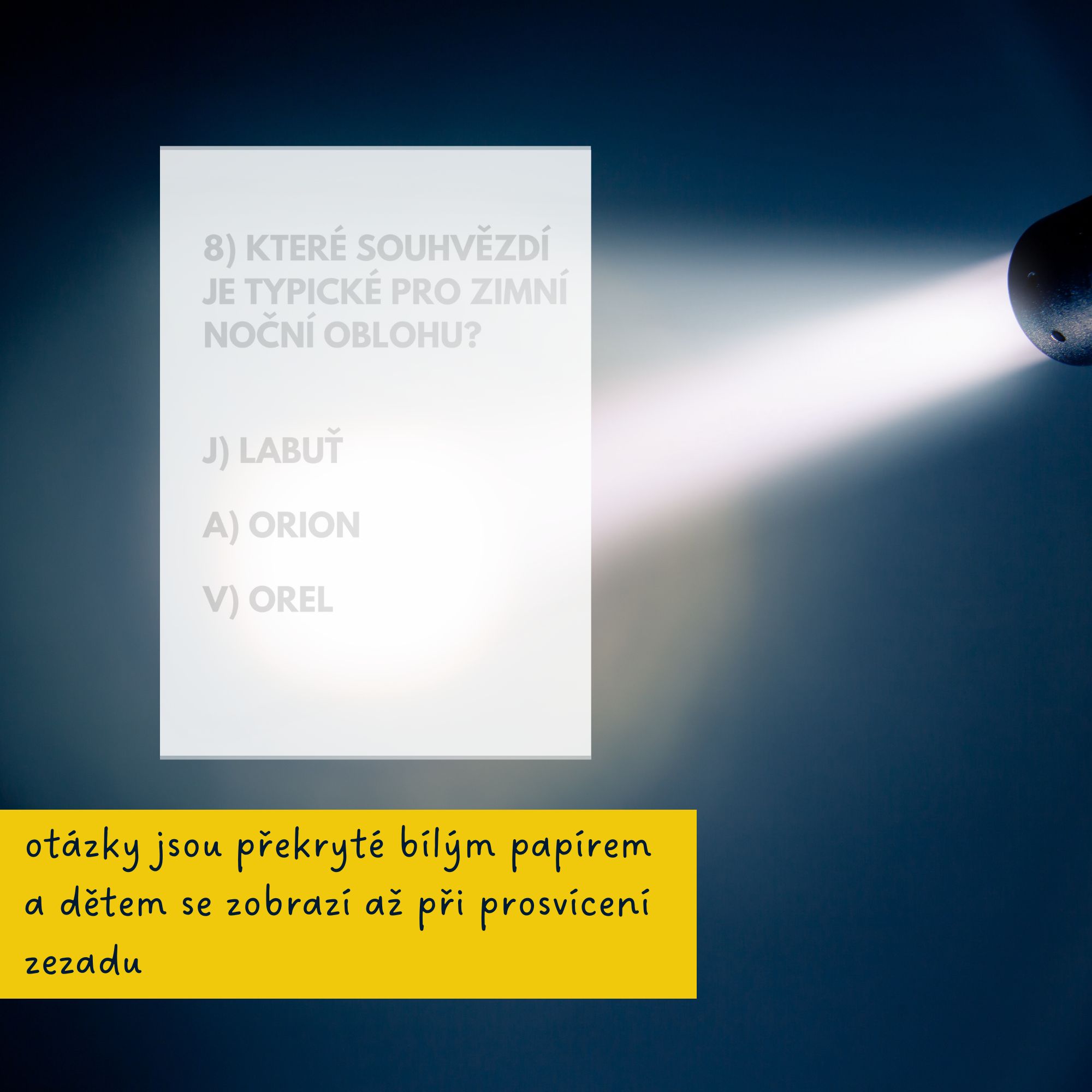 Úkolem dětí je projít za tmy danou trasu a hledat po cestě papíry s otázkami. Ty jsou ale skryté - aby byly vidět, je nutné papír zezadu prosvítit baterkou. Za správnou odpověď dítě získá písmenko a na konci z nich vytvoří tajenku: SLUNOVRAT.