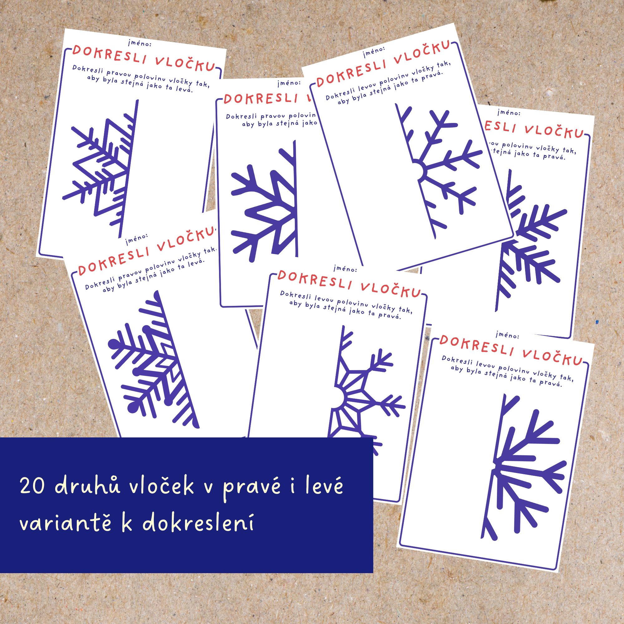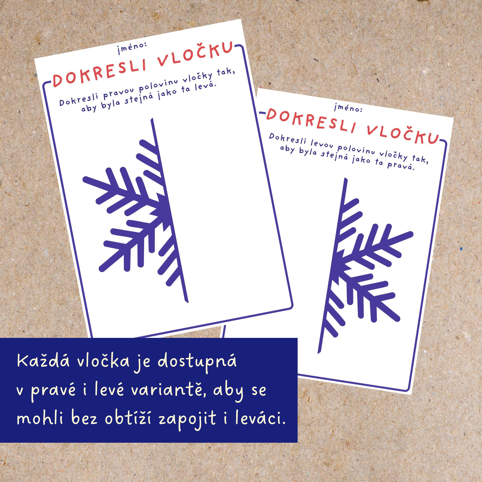 ❄️Sada obsahuje celkem 42 listů: 20 různých druhů vloček k dokreslení v pravé i levé variantě (aby se mohli snadno zapojit i leváci) a 2 listy s možností navrhnout svou vlastní šesticípou nebo osmicípou vločku.