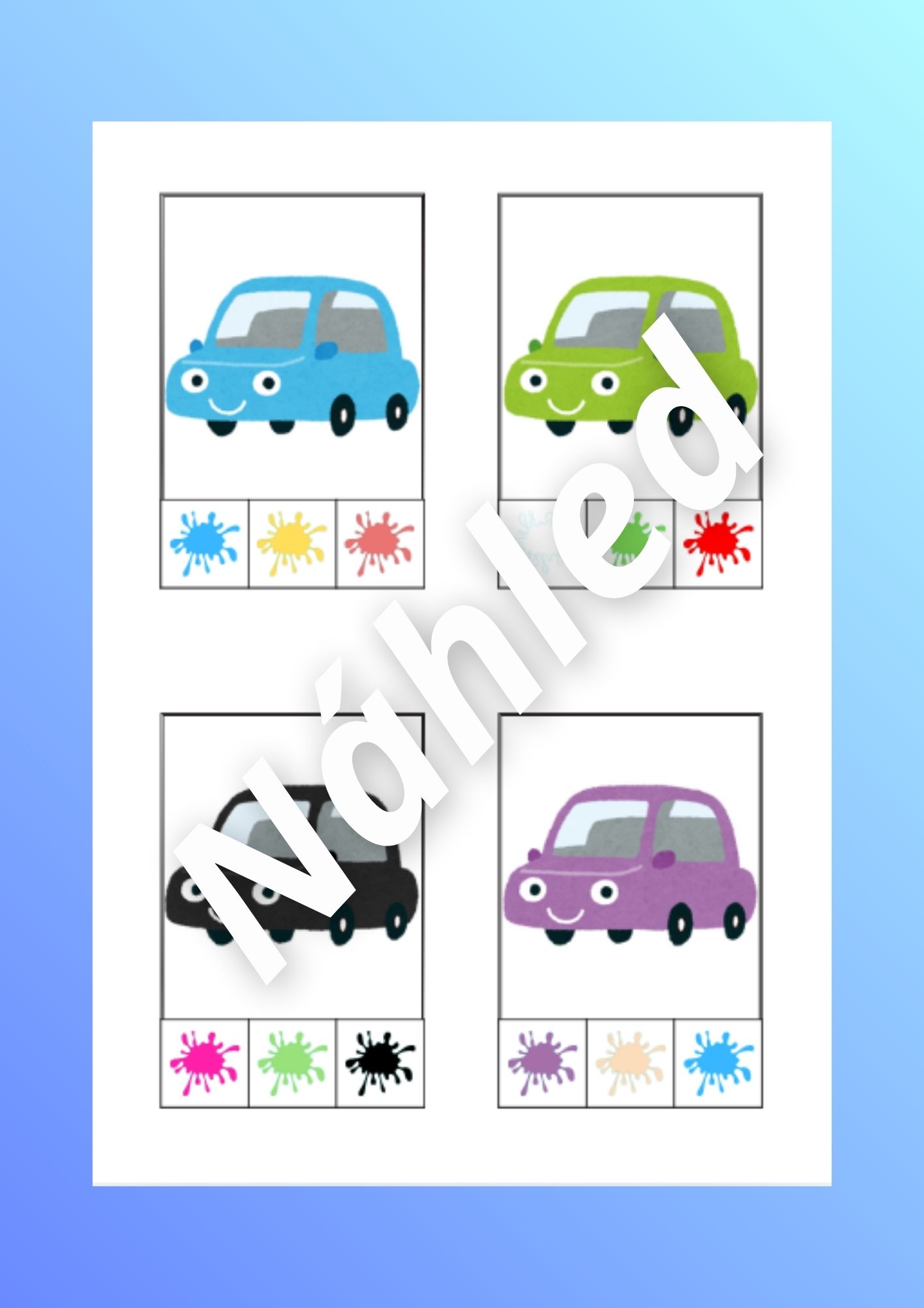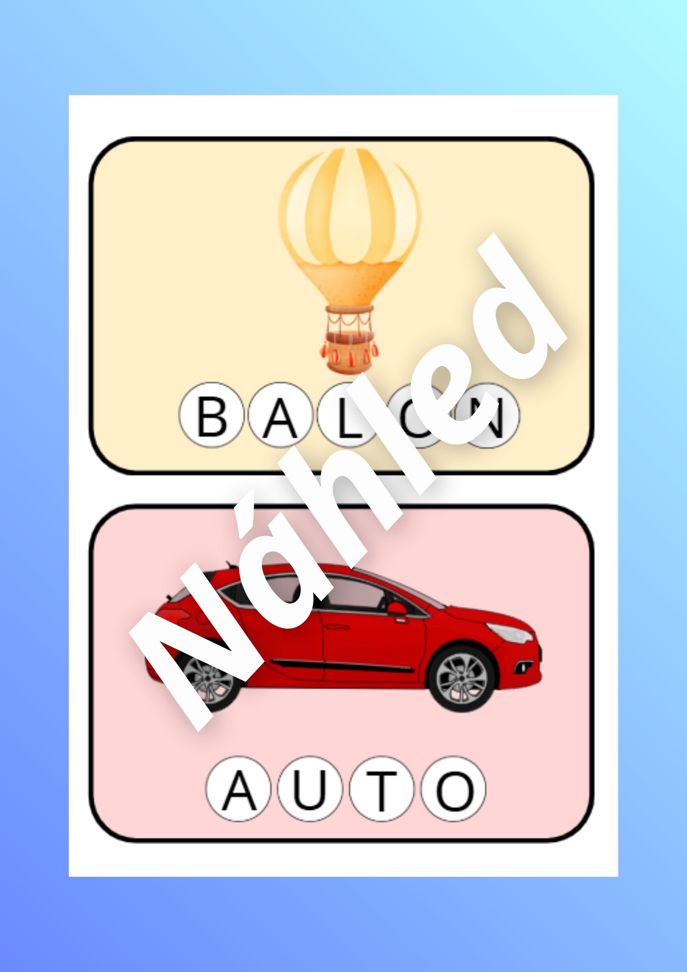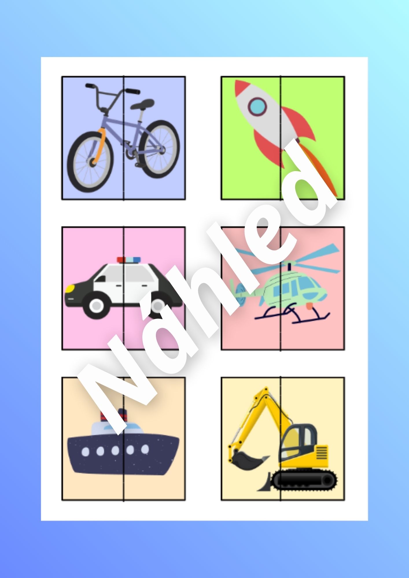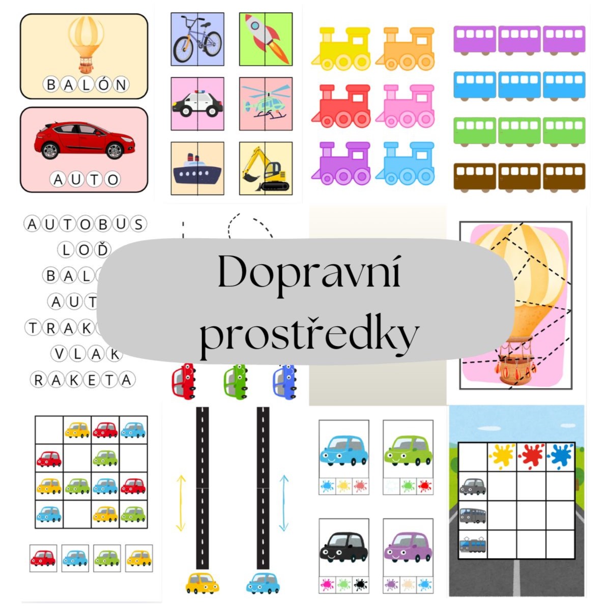 - Kartičky s názvy dopravních prostředků (str. 3-9) - rozstříháme písmenka na straně 9 a 10 a děti pak hledají a skládají písmena na kartičky s dopravními prostředky.
