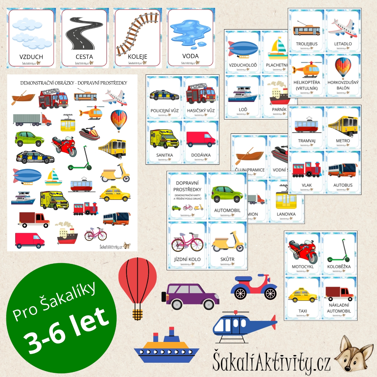 Zábavný a vzdělávací soubor pro děti, který rozšiřuje slovní zásobu, podporuje třídění a přiřazování dopravních prostředků podle prostředí a napomáhá orientaci v běžném světě kolem nás.