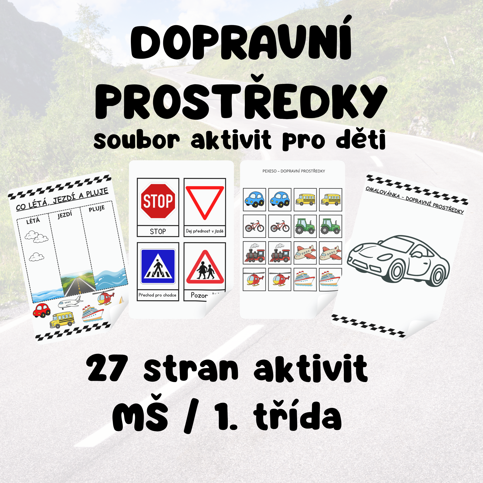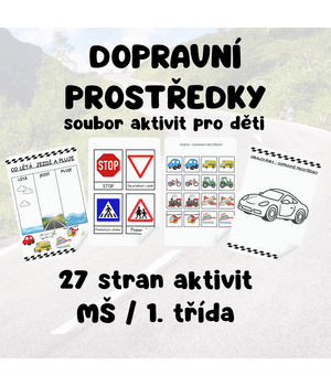 Soubor 27 zábavných pracovních listů s tématem dopravní prostředky. Materiál obsahuje různé aktivity jako třídění (co létá, jezdí a pluje), dopravní značky, pexeso, omalovánky a další úkoly pro děti. Aktivity rozvíjejí logické myšlení, pozornost, poznávání dopravních prostředků i základních pravidel silničního provozu. Materiál je vhodný pro děti v mateřské škole i na 1. stupni ZŠ. PDF ve formátu A4 připravené k okamžitému tisku. Pro delší životnost doporučujeme materiál po vytištění zalaminovat.