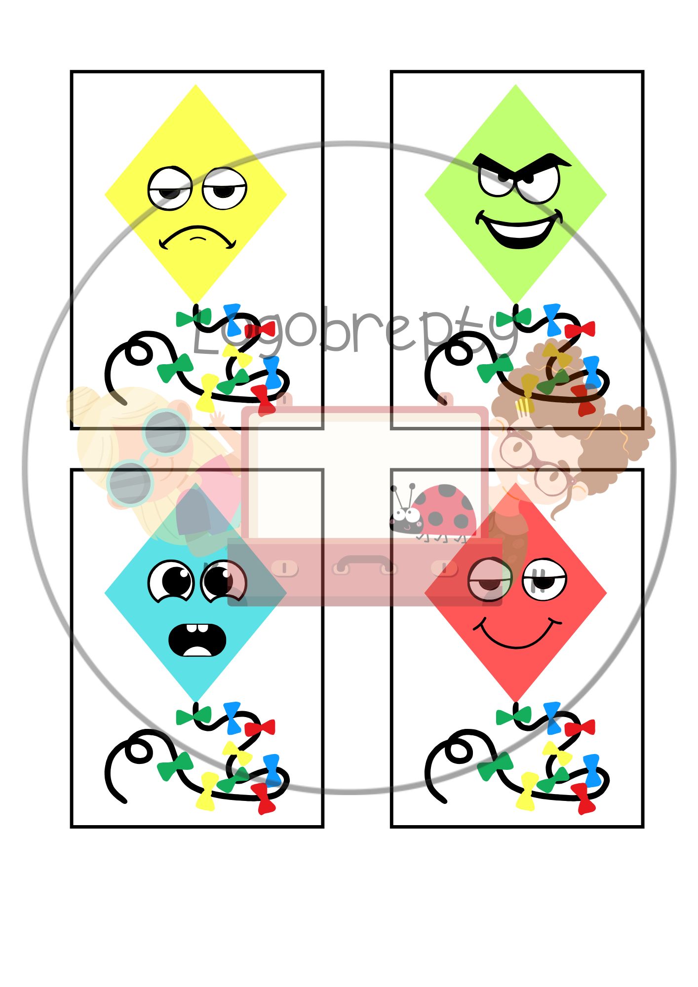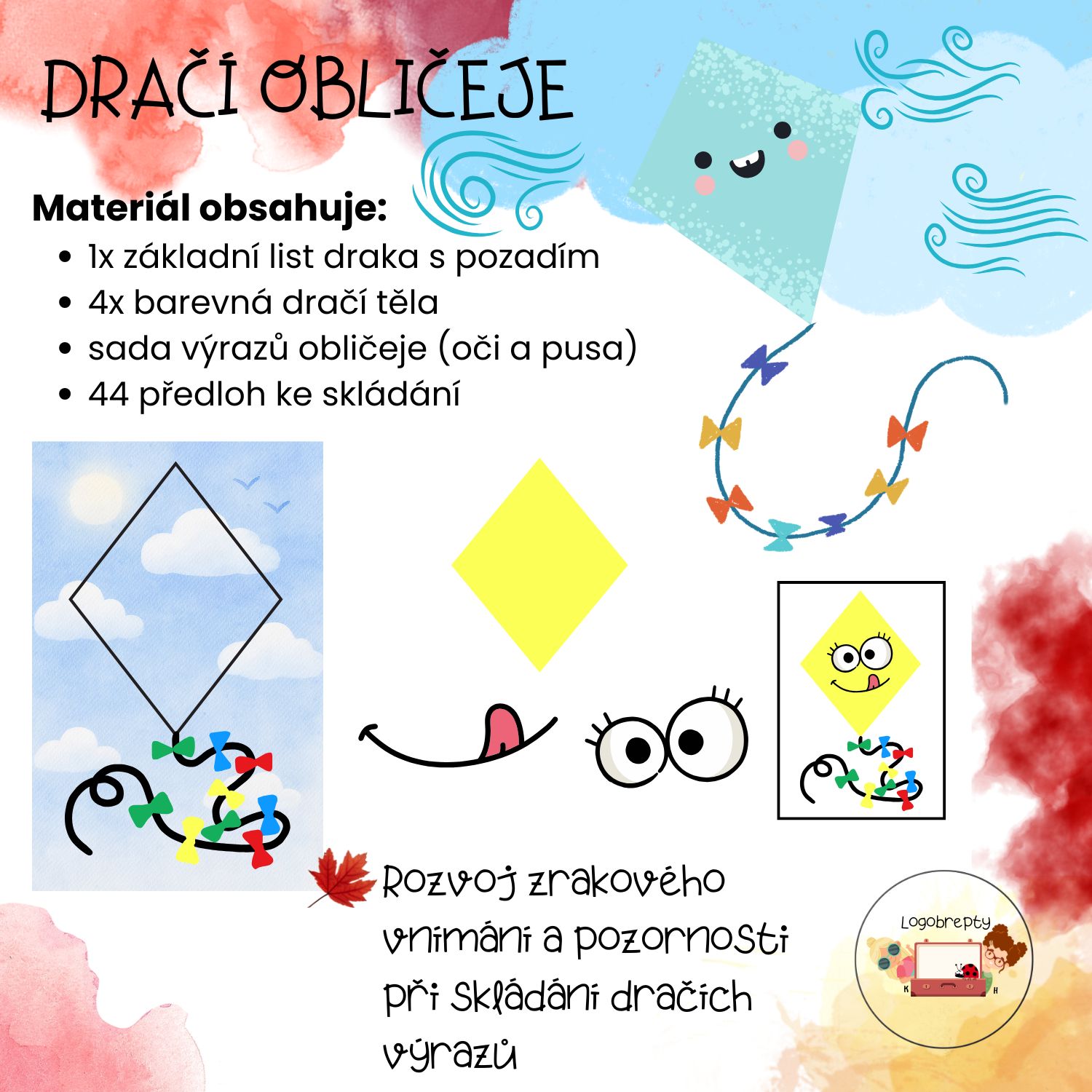 Pomůcka Dračí obličeje rozvíjí zrakové vnímání, pozornost a schopnost porovnávat detaily hravou formou. Děti podle předloh skládají obličeje draků – vybírají správnou barvu, tvar očí i pusy a vytvářejí tak nejrůznější výrazy.