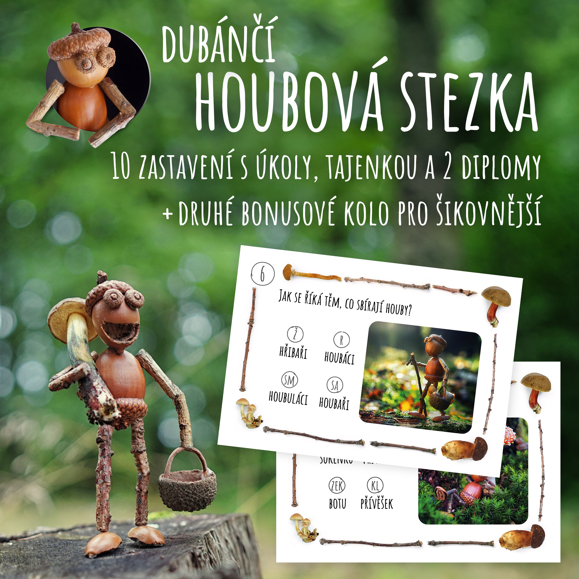 Dubánčí houbová stezka je zábavná naučná hra, při které děti procházejí 10 zastavení v přírodě, na zahradě, ve škole nebo v družině, hledají správné odpovědi na otázky o houbách a sbírají písmenka do tajenky. U každé otázky najdou čtyři možné odpovědi – jen jedna je správná. U každé odpovědi jsou písmenka nebo slabiky, a když děti přepíší ta správná na záznamový arch podle čísla otázky, vyluští tajný vzkaz od dubánků. Stezka navíc obsahuje bonusový úkol – z písmenek u špatných odpovědí lze složit názvy různých hub. Na konci čeká děti diplom za splnění celé stezky.