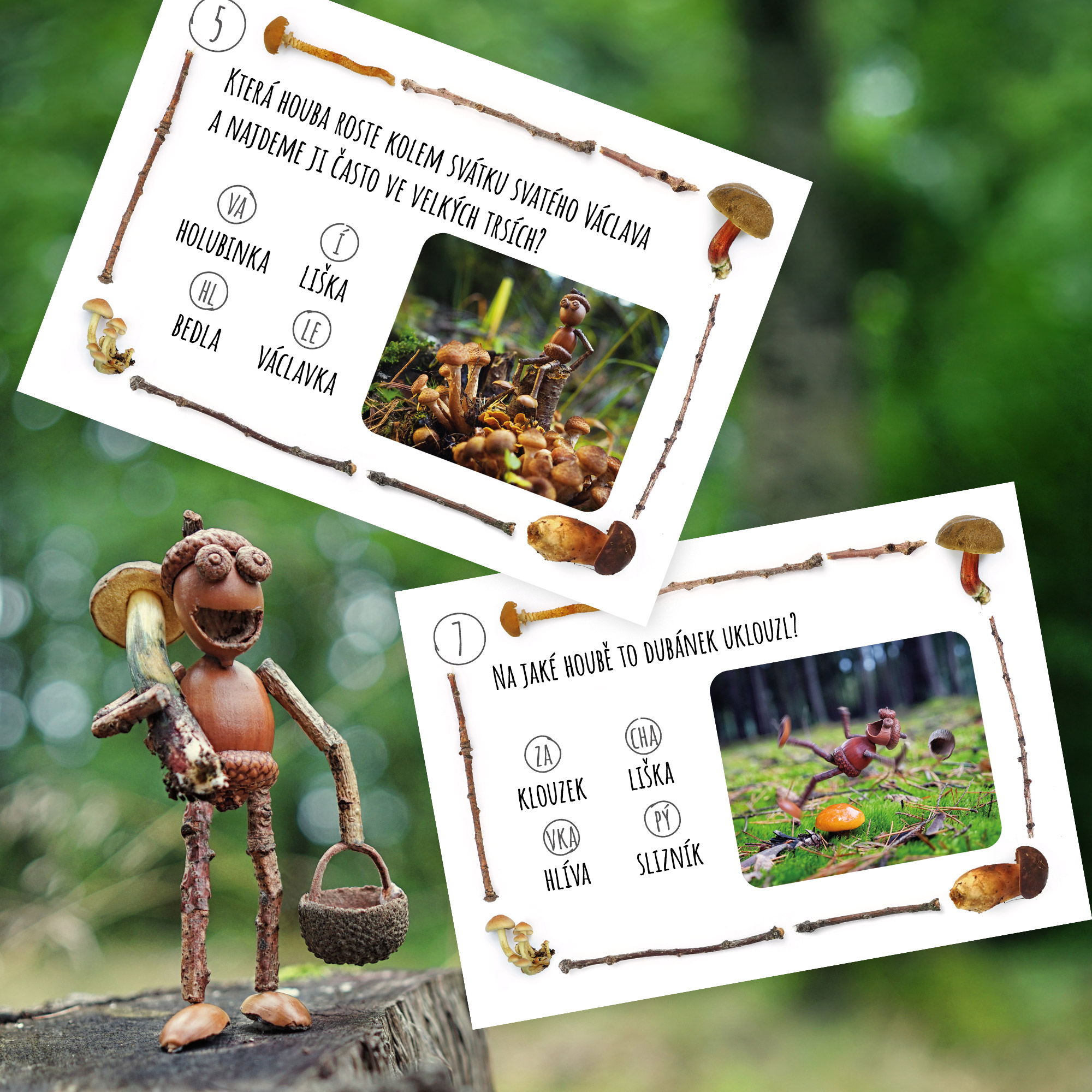 - 10 zastavení s otázkami a obrázky - Každé zastavení obsahuje jednu otázku o houbách, doplněnou obrázkem dubánka s houbou a čtyřmi odpověďmi.