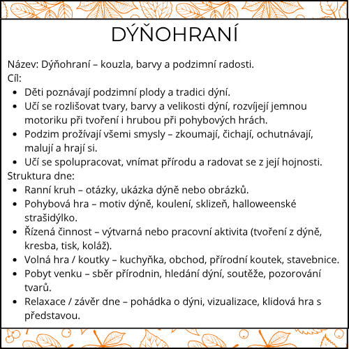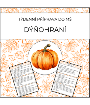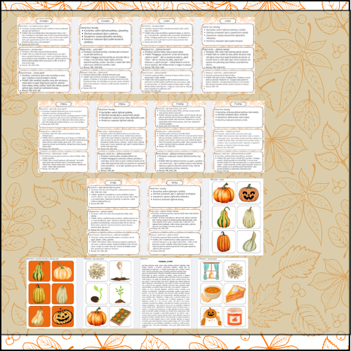 Podzim je časem oranžových tónů, voňavých dýní a kouzelné nálady. Tento digitální materiál „Dýňohraní“ vám nabídne ucelený program na celý týden, díky kterému děti hravou formou poznají dýni všemi smysly – dotykem, chutí, vůní i fantazií. Každý den přináší jiné dýňové dobrodružství, tvoření, pohyb i klidné zakončení dne.