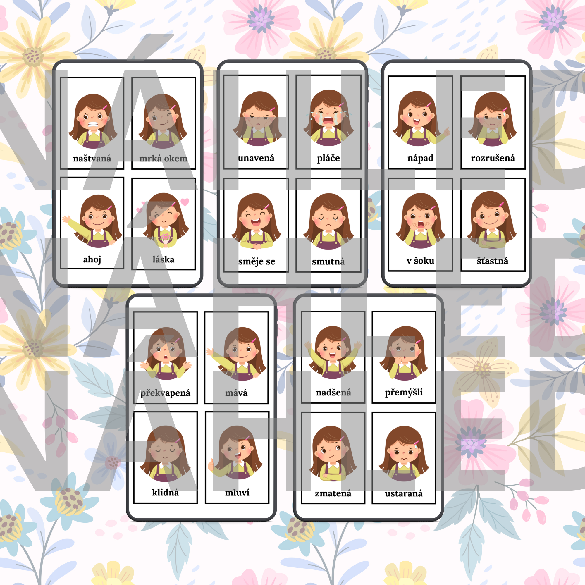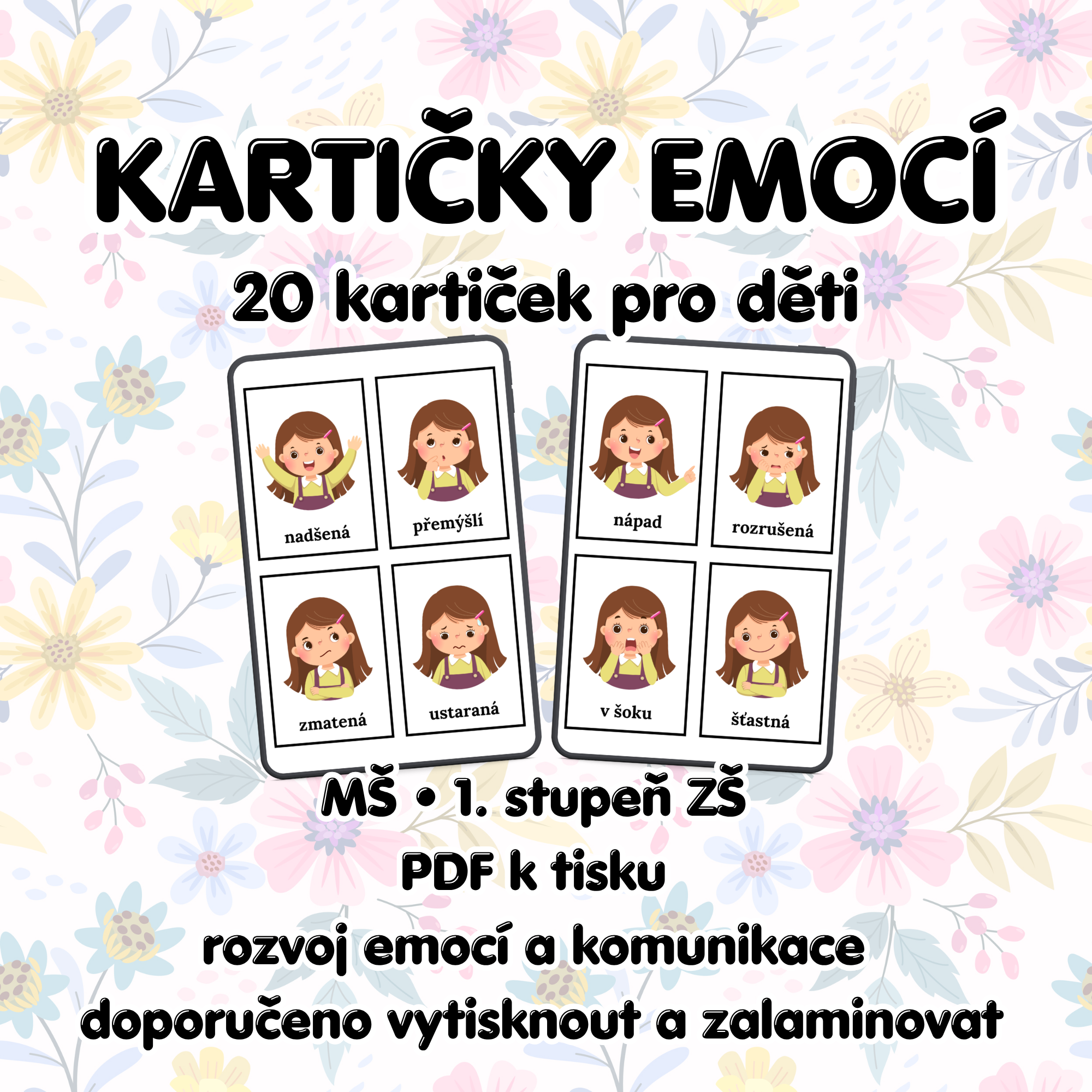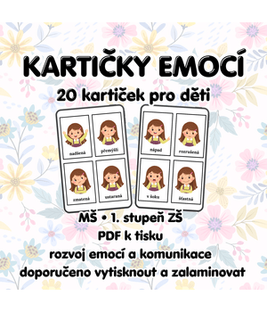 Soubor 20 výukových kartiček zaměřených na poznávání emocí a rozvoj komunikace u dětí. Kartičky pomáhají dětem rozpoznávat a pojmenovávat různé pocity a emoce. Materiál je vhodný pro děti v mateřské škole i na 1. stupni základní školy. PDF ve formátu A4 je připravené k tisku. Pro delší životnost doporučujeme kartičky po vytištění zalaminovat.