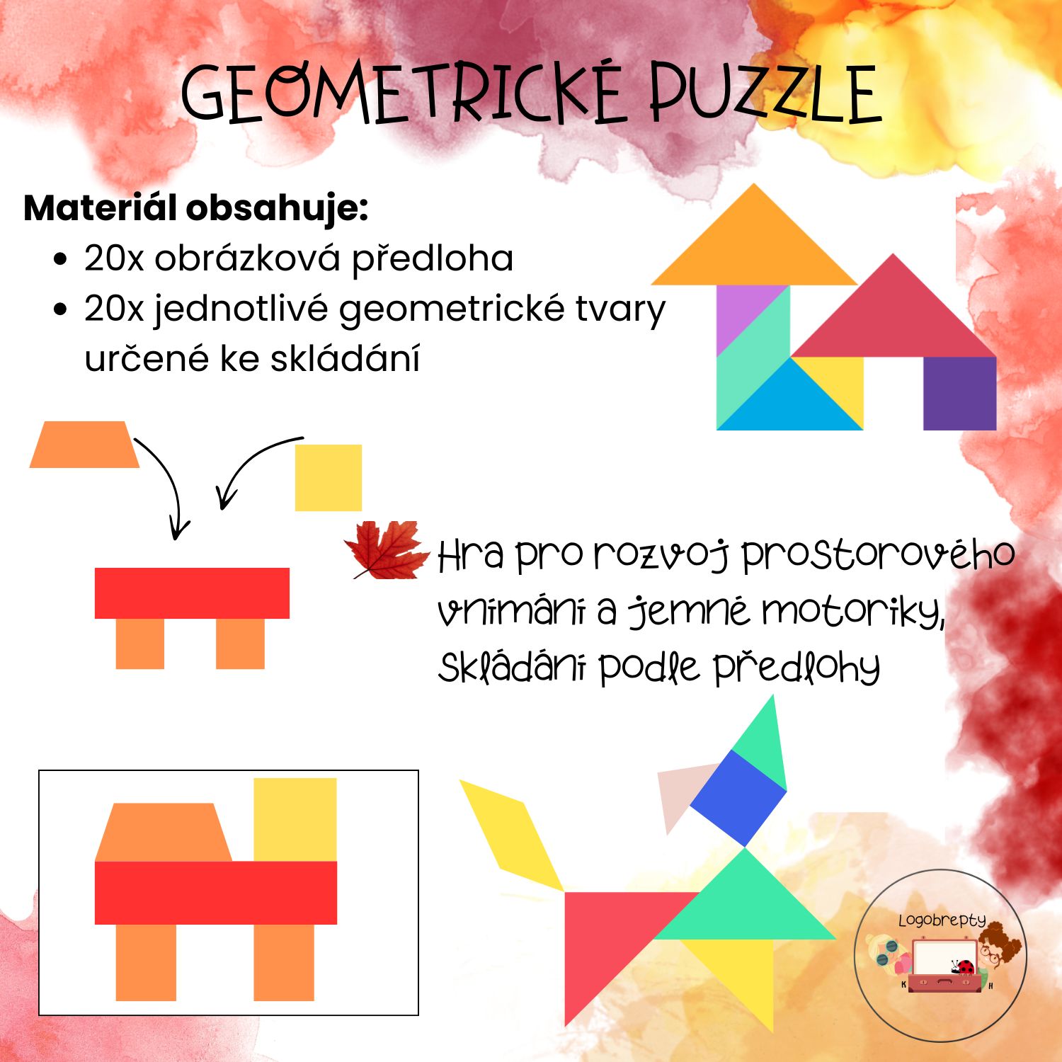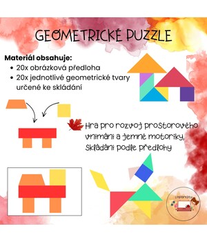 Didaktická pomůcka rozvíjející zrakové vnímání, jemnou motoriku a schopnost přesného skládání. Děti z barevných geometrických tvarů skládají obrázek podle předlohy – tvarem i barvou musí jednotlivé dílky přesně odpovídat.