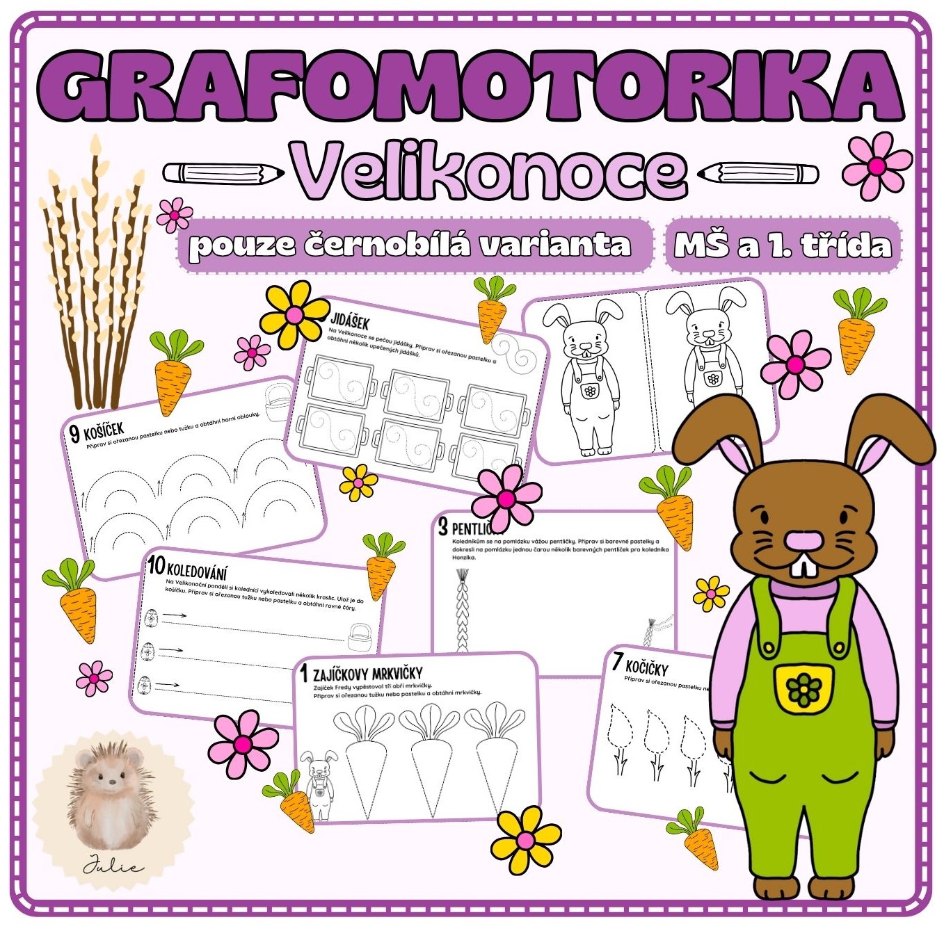 Oslavte příchod svátků jara hravou formou grafomotoriky! Tento pracovní materiál zavede děti do světa velikonočních tradic, kde potkají zajíčka Fredyho, upečou si jidášky nebo ozdobí pomlázku. Děti při kreslení pomáhají zajíčkovi sázet mrkvičky, dokreslují beránkovi kudrlinky nebo připravují košíček na koledu – a přitom přirozeně procvičují pohyby ruky důležité pro budoucí psaní.