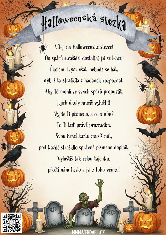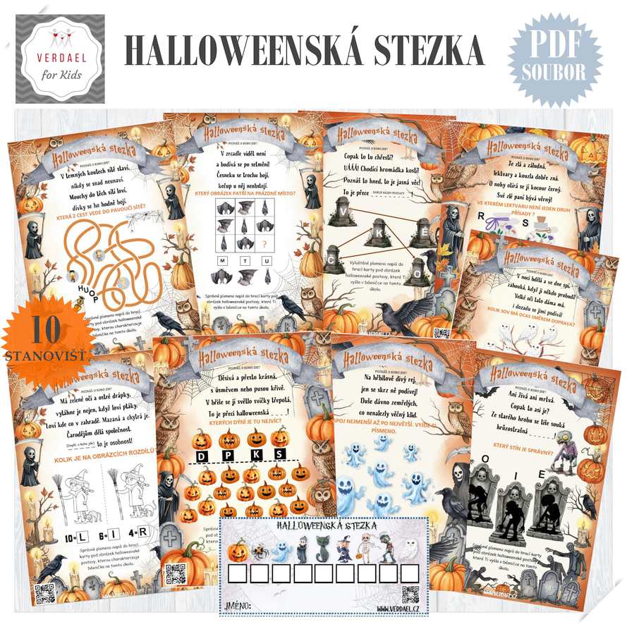 je stezka pro děti určená ke zpestření strašidelné noci a vytvoření strašidelné stezky ideálně právě na Halloween. Stezka je plná zábavných úkolů. Obsahuje nápovědy v podobě prosvěcovacích obrázků, což z ní činí i stezku použitelnou pro malé děti, protože prosvětlovací obrázky nemusí být jen přímo u úkolu, ale můžete je dětem schovat v okolí úkolu a nechat je hledat a tato činnost děti velmi baví. Pro starší tyto obrázky poslouží jako kontrola, že úkol vyřešili správně. Není však nezbytně nutné je ke hře přidávat.