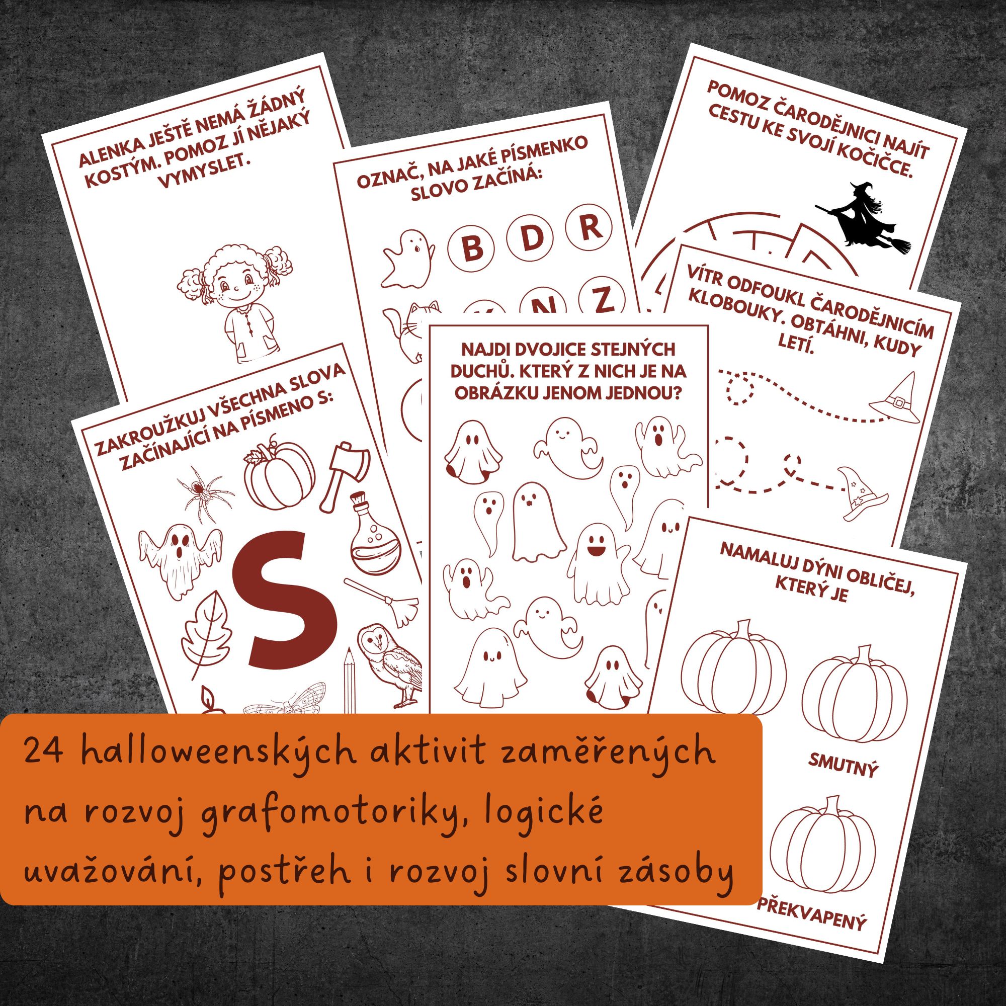🎃 Přichází říjen, pomalu se stmívá a je čas přivítat temnou část roku aktivitami, které zabaví, ale při kterých i příjemně mrazí. Halloweenský balíček plný aktivit pro předškolní děti (nebo prvňáčky) zabaví, ale děti při plnění úkolů procvičí také postřeh, logické uvažování i základy grafomotoriky.