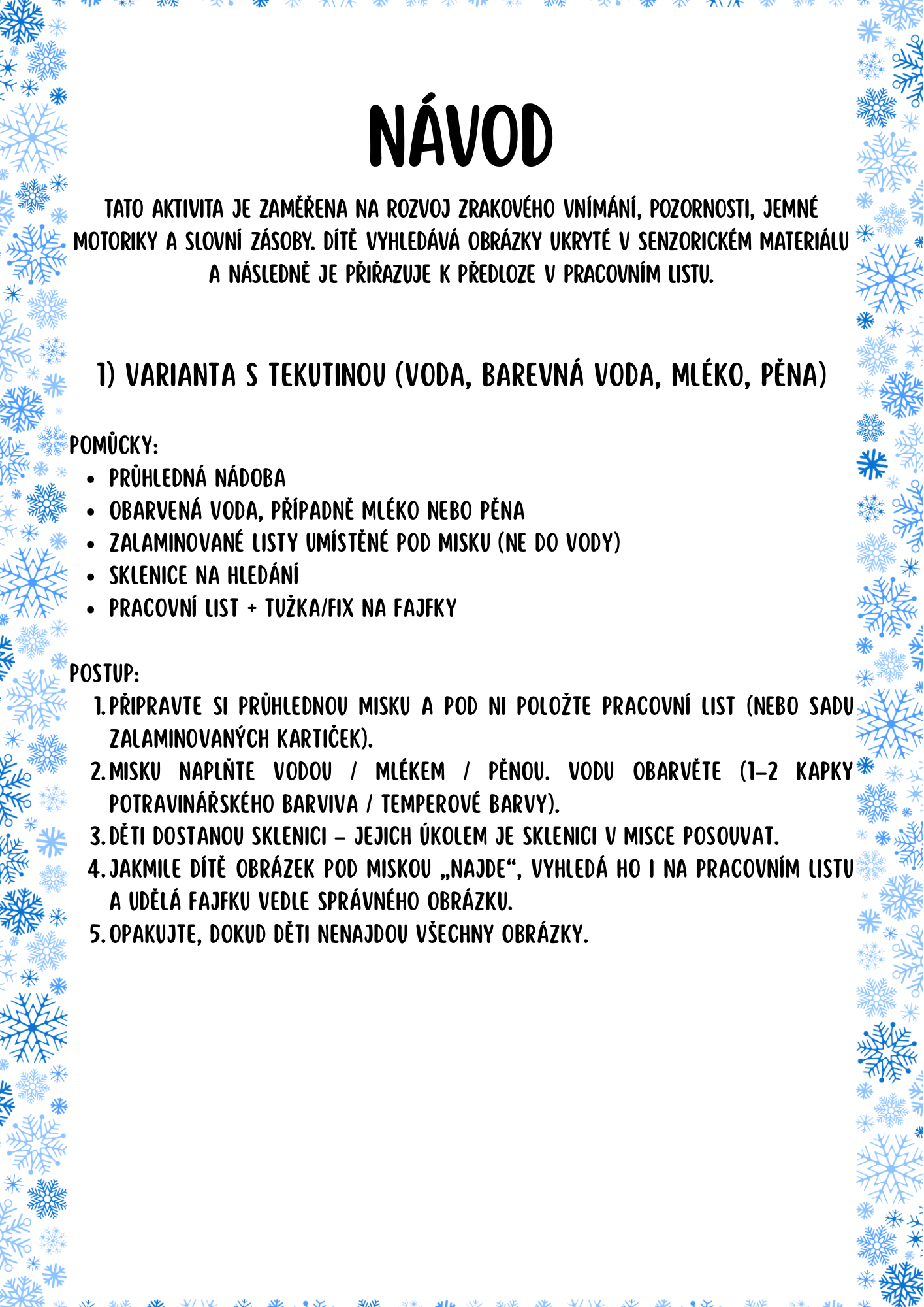✔️ Variantu s tekutinami (voda, barevná voda, mléko, pěna) – děti pomocí sklenice vyhledávají obrázky zimních sportů a po nalezení je označují fajfkou v pracovním listu.