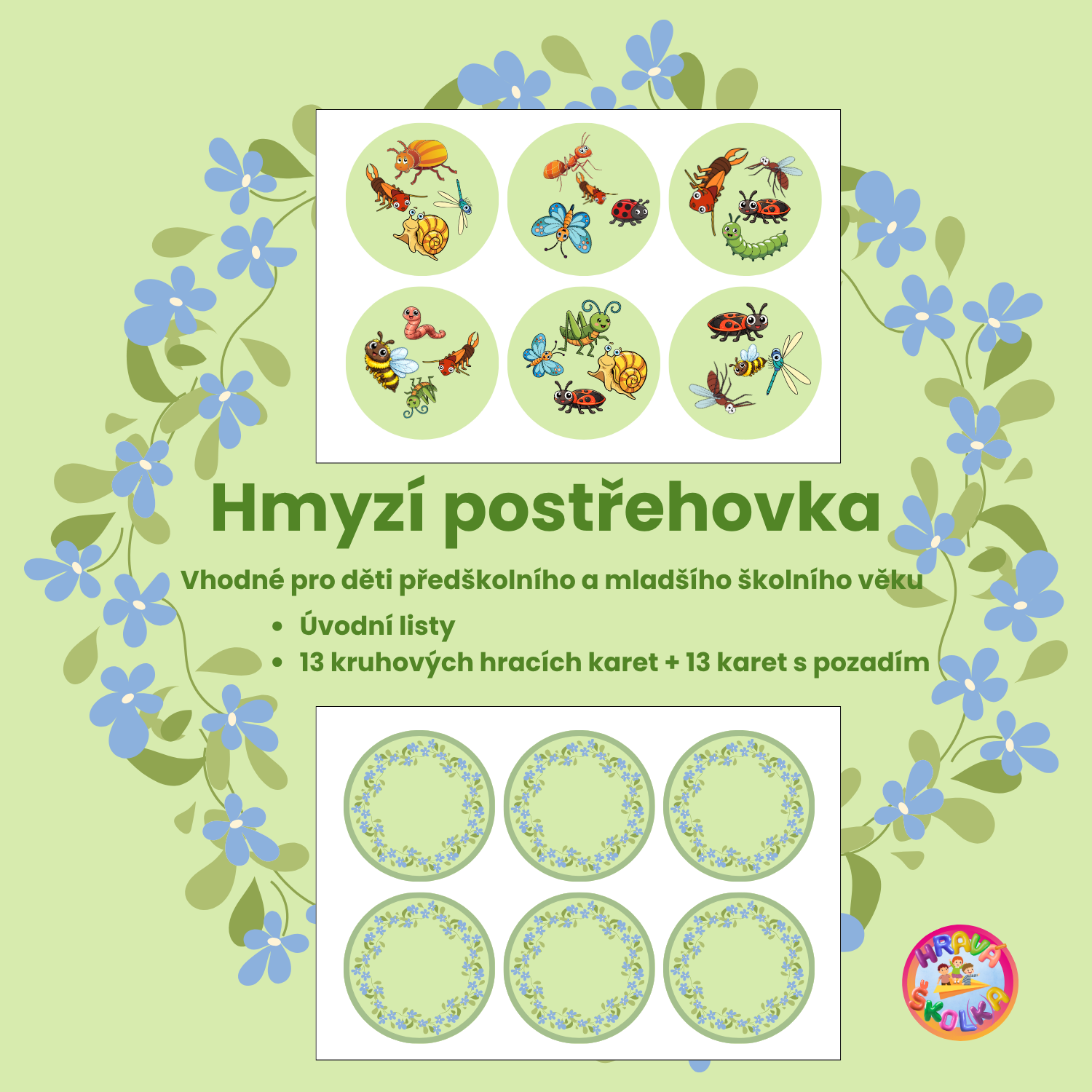 Na hrací kartě jsou vždy 4 obrázky hmyzu, na dvou obrázcích jsou vždy jen dva stejné obrázky, které mají děti vyhledat.