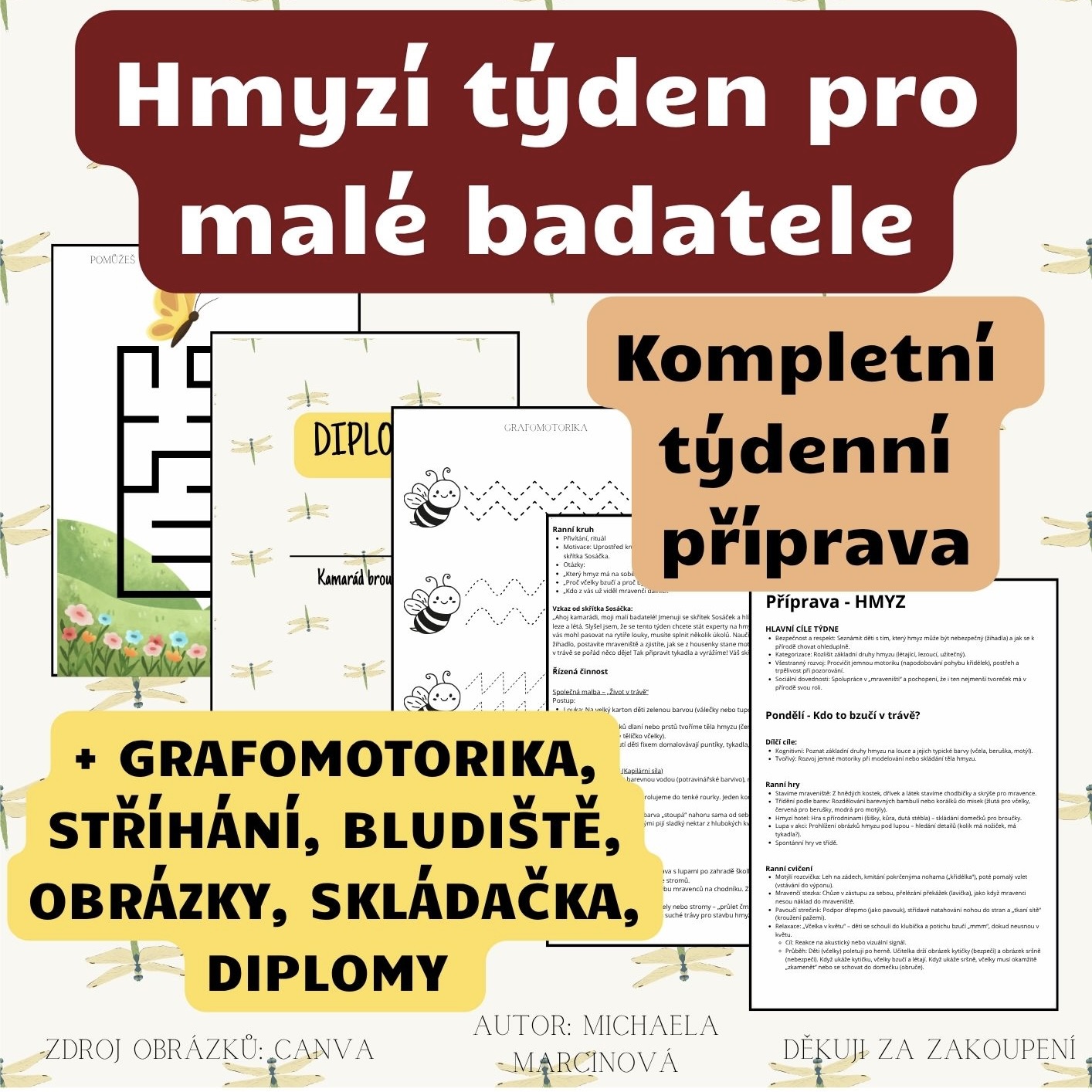 Tento materiál je určen pedagogům mateřských škol jako praktická pomůcka pro plánování a realizaci tematického týdne o hmyzu a životě na louce. Nabízí přehledně zpracovanou týdenní přípravu, kterou lze ihned využít v každodenní praxi při seznamování dětí s fascinujícím světem drobných živočichů.