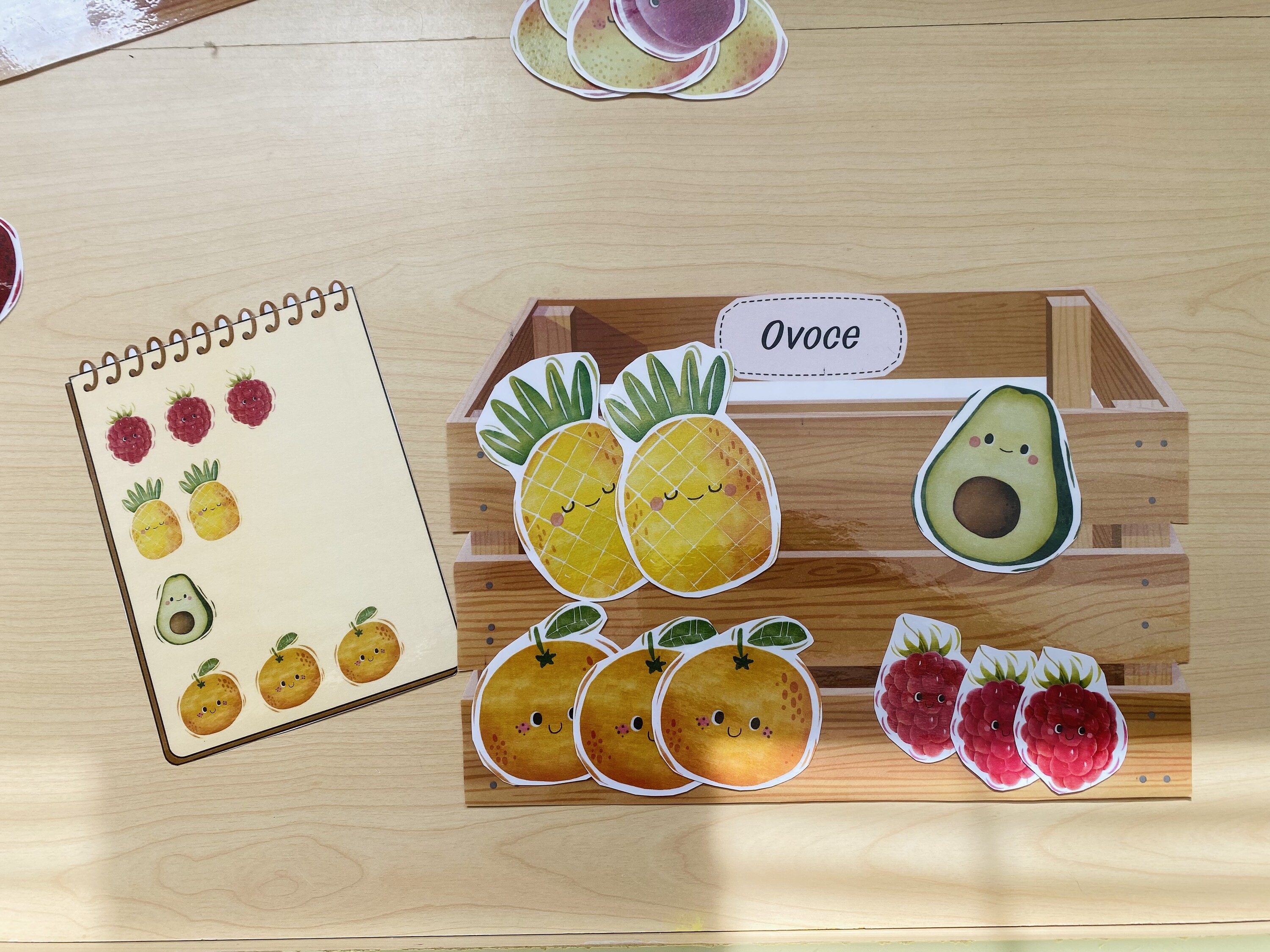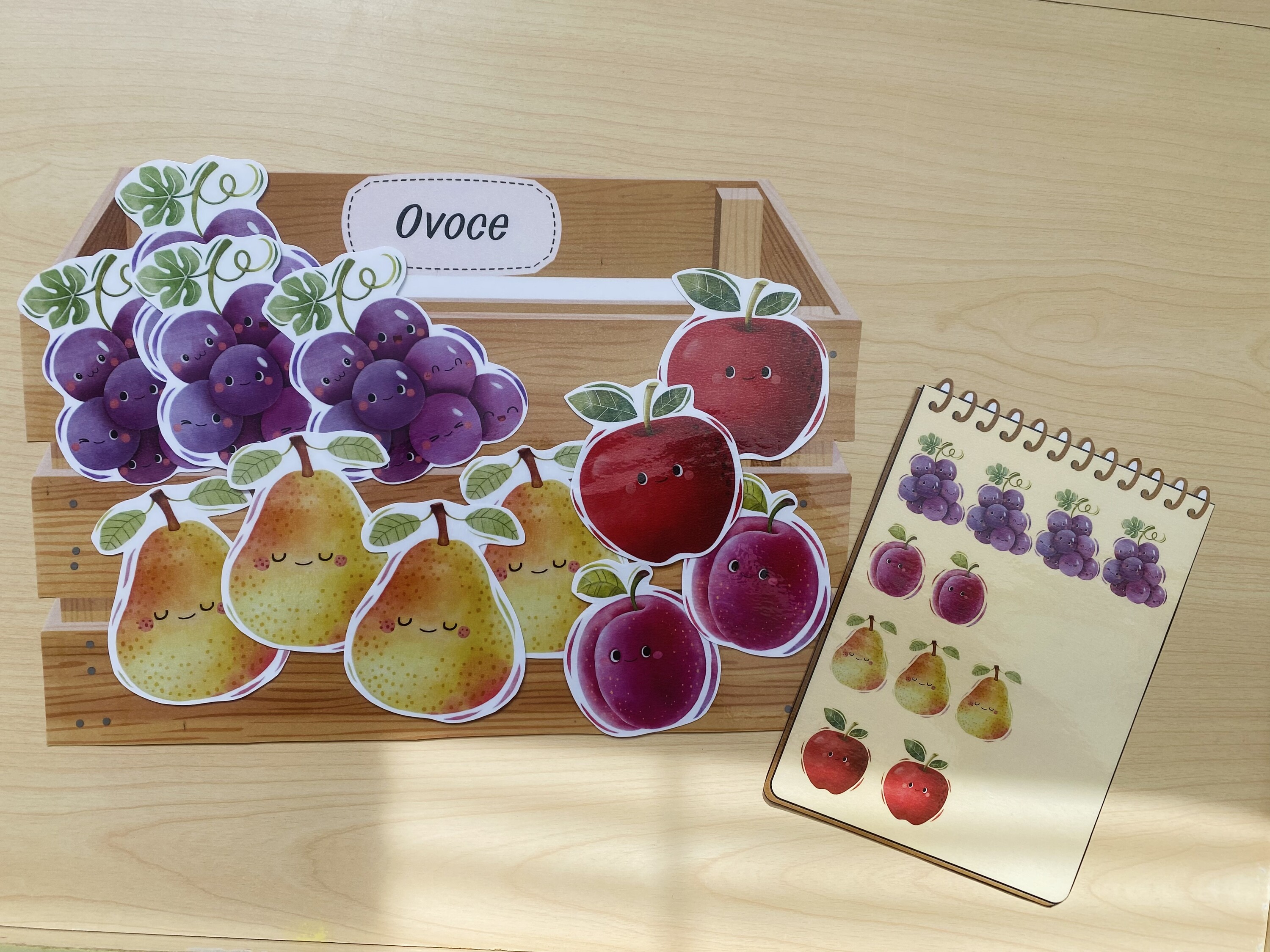Kartičky slouží pro děti jako návod, kolik ks ovoce a jaký druh ovoce přiloží - nalepí na bedýnku.