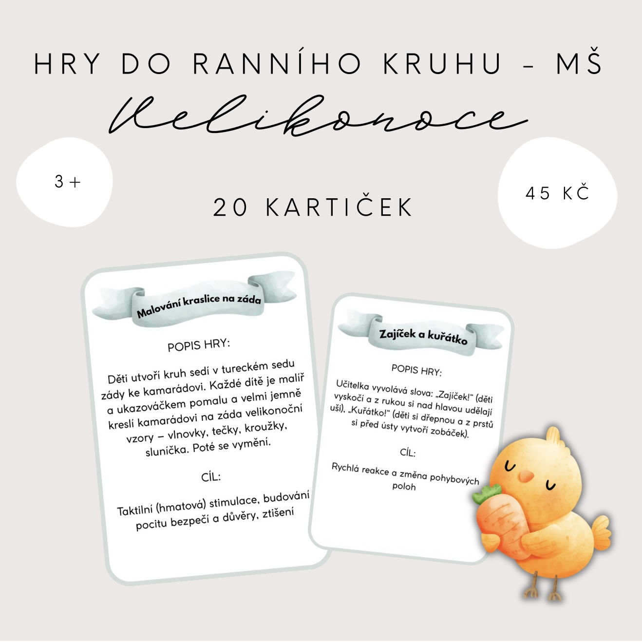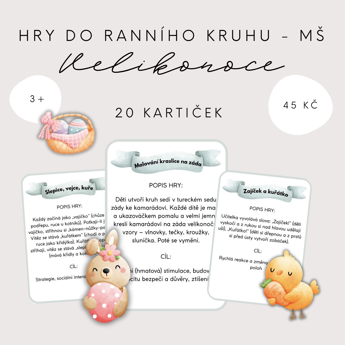 Představujeme Vám náš soubor 20 her vhodných do ranního kruhu na téma Velikonoce, které jsou určeny dětem věku od 3 do 6 let.