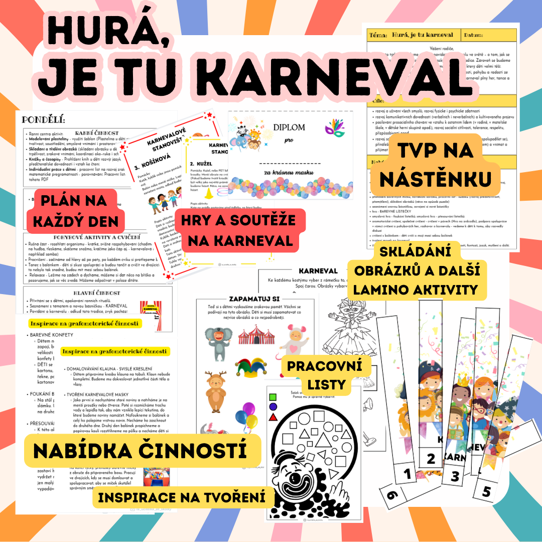 Díky tomuto PDF materiálu si děti zábavnou formou procvičí různé dovednosti, rozvinou fantazii a užijí si karnevalové činnosti a aktivity.