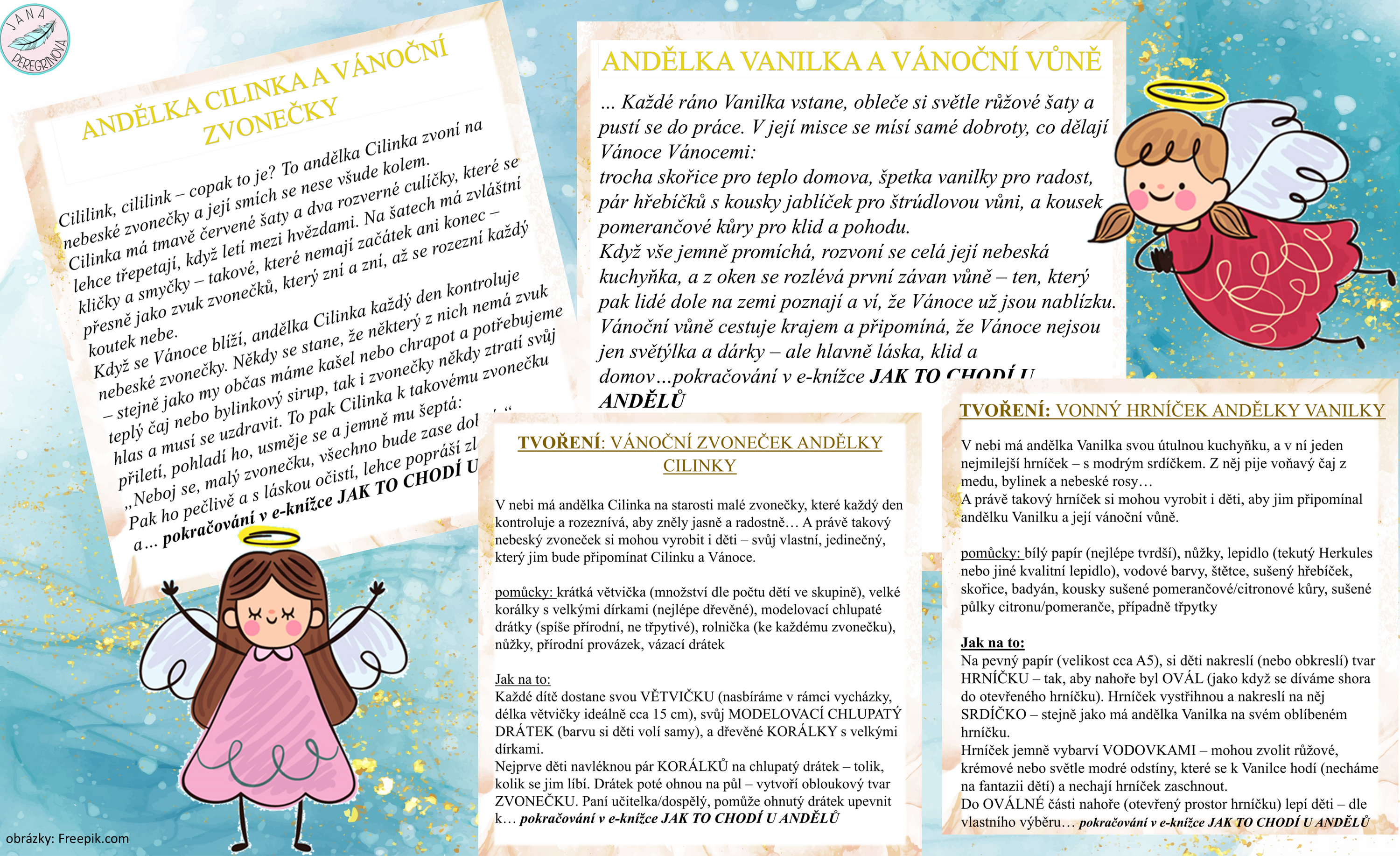 Vanilka v nebeské kuchyňce míchá vánoční vůně – pomeranč, skořici, vanilku, které se linou až na zem a přinášejí teplo a pohodu Vánoc. Děti si mohou vytvořit voňavý hrníček, který jim bude připomínat andělku Vanilku. - ANDĚLKA CILINKA A NEBESKÉ ZVONEČKY