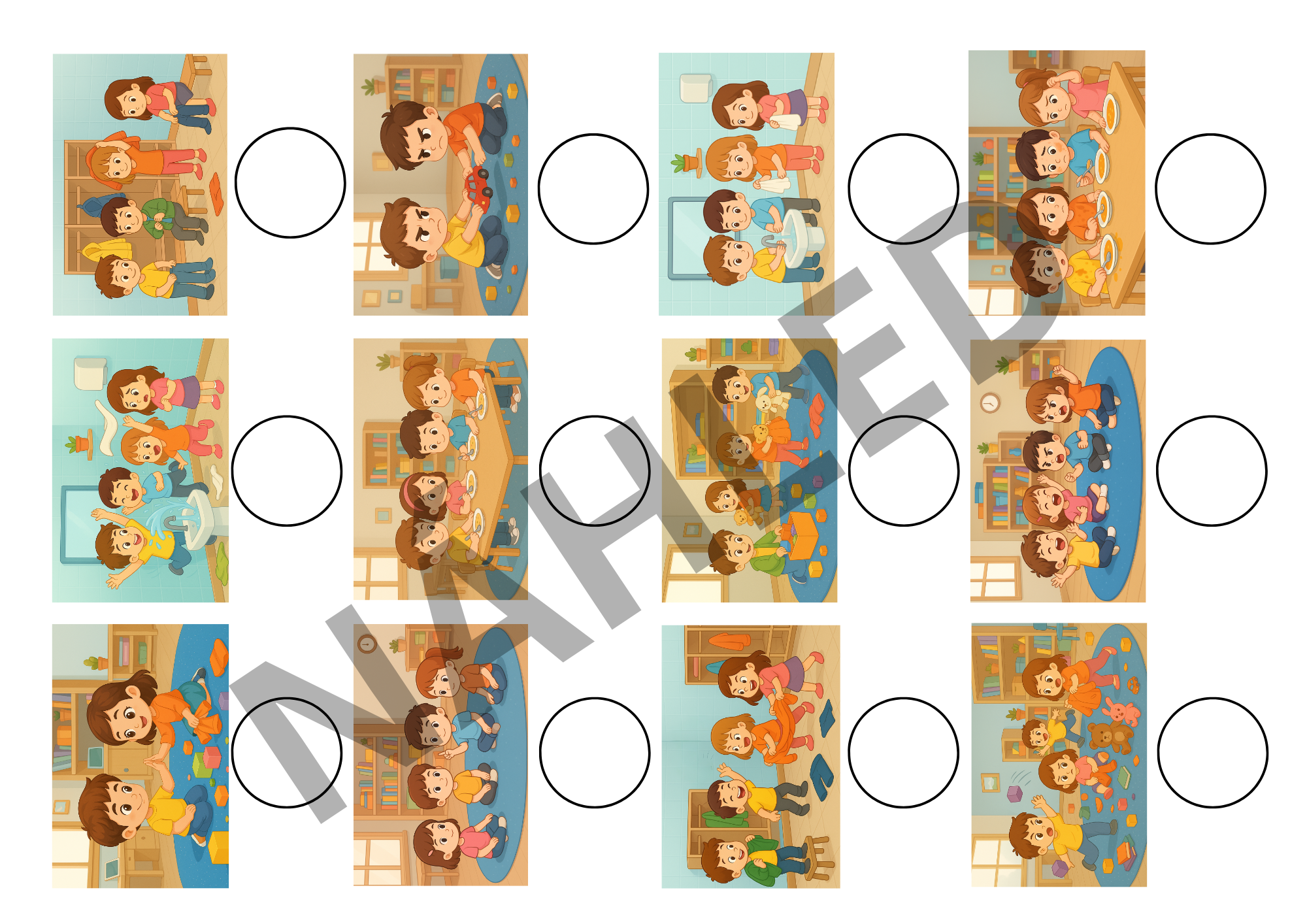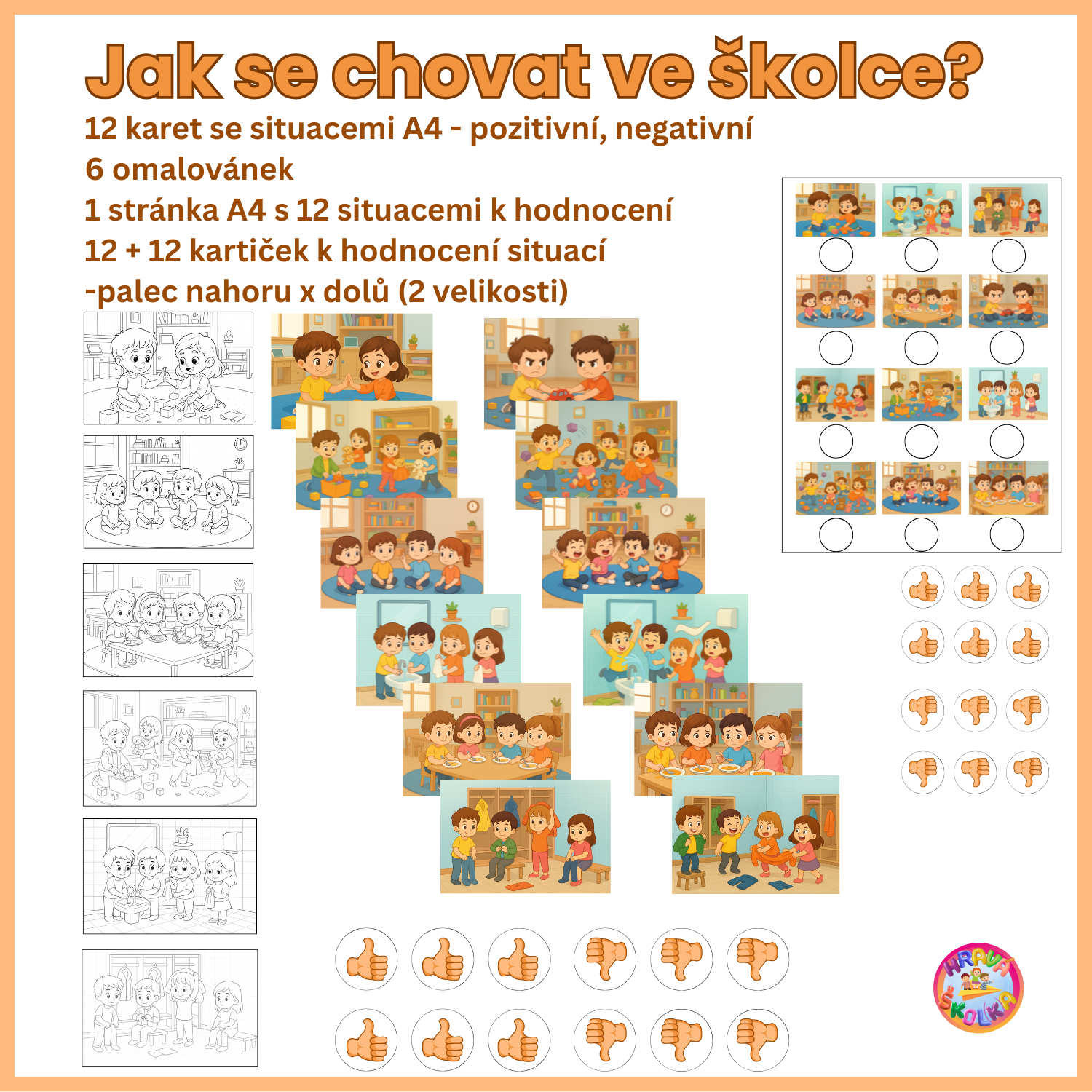 Soubor obsahuje 12 demonstračních karet A4 s pozitivními a negativními situacemi, 6 omalovánek k pozitivním situacím, 1 pracovní list A4 k individuální, párové nebo skupinové práci, hodnotící kartičky ve dvou velikostech. Soubor je určen pro děti předškolního věku. Rozvíjí sociální a komunikační dovednosti, učí děti vyhodnocovat své chování a vede je k zodpovědnosti a k vytváření příjemného klimatu ve třídě. Demonstrační karty lze využít k rozhovorům o situacích ve školce, děti mohou popisovat situace a vyjadřovat se k nim, co a proč je správné x špatné. Jak se děti v různých situacích cítí, jak by si přály, aby to vypadalo ve vaší školce. Ke kartám mohou doplňovat hodnotící kartičky. Pracovní list je možné využít pro individuální, párovou nebo skupinovou práci v návaznosti na rozhovory. Omalovánky jsou připomenutím pozitivních situací a rozvíjí také jemnou motoriku.