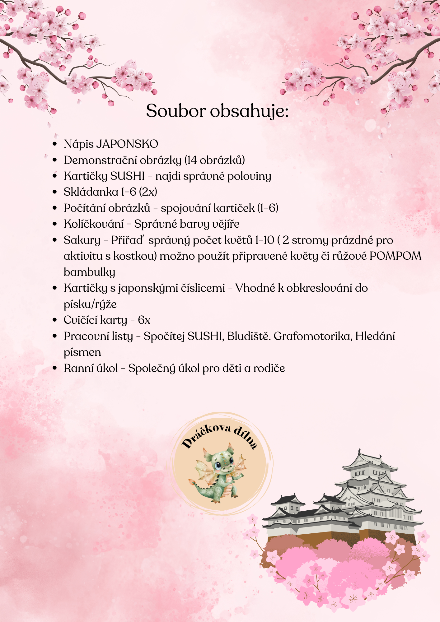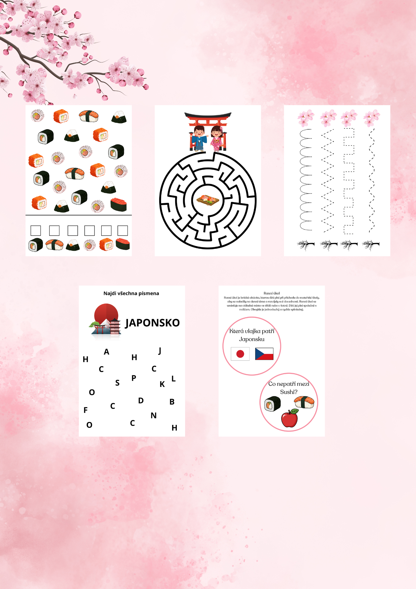 Vydejte se s dětmi na dobrodružnou cestu do Japonska! Tento tematický materiál přibližuje dětem japonskou kulturu, symboly i tradice zábavnou, pohybovou a názornou formou. Ideální pro mateřské školy, přípravné třídy i domácí učení.