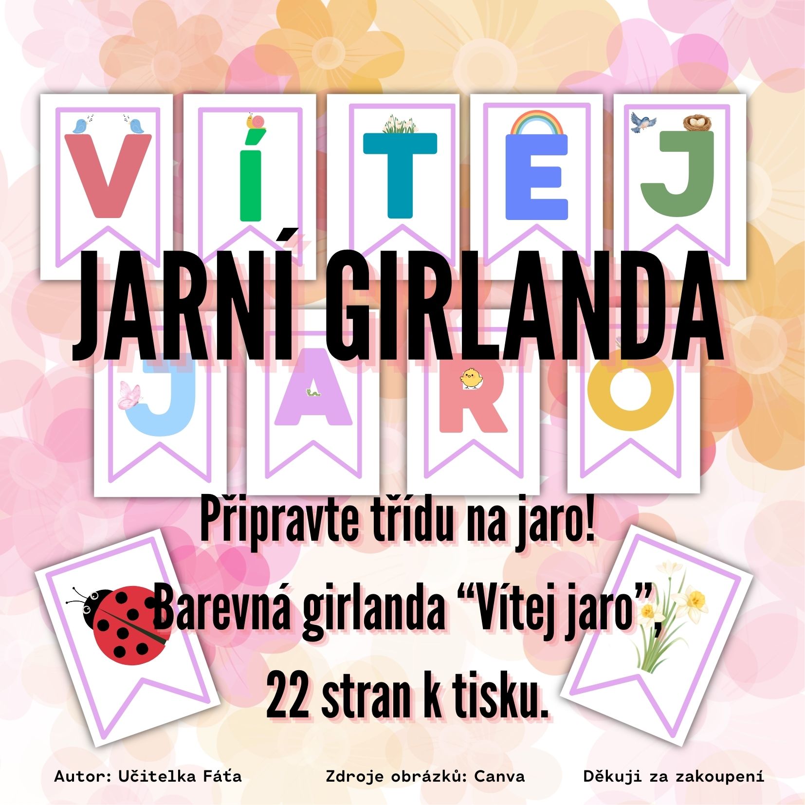 Tato jarní girlanda je určena k tisku slouží jako dekorace. Soubor obsahuje 22 stran s barevnými písmeny tvořícími nápis „Vítej jaro“ a veselými jarními motivy – květinami, motýly, ptáčky a dalšími symboly jara.