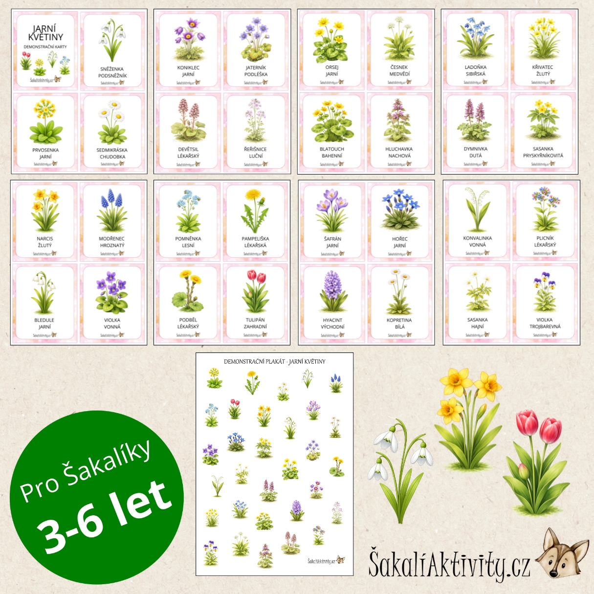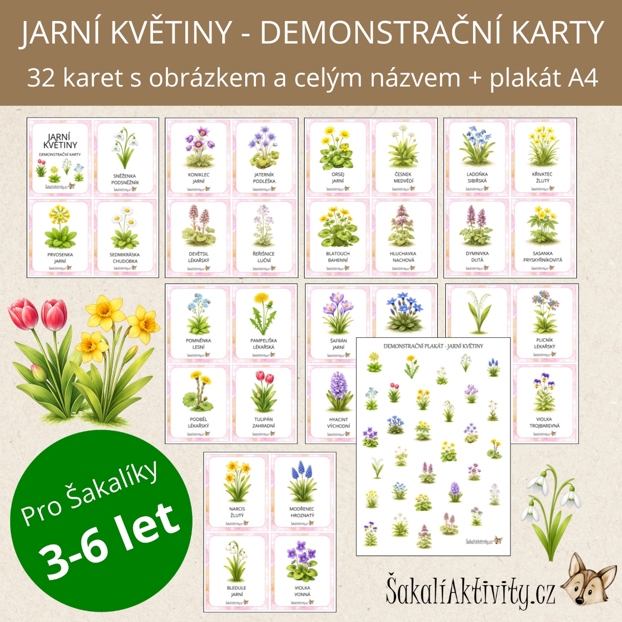 Materiál obsahuje 32 demonstračních karet ve formátu A6 s ilustracemi jarních květin. Obrázky jsou dětem snadno rozpoznatelné, přehledné a vhodné pro práci ve skupině i individuální činnosti. Součástí souboru je také demonstrační plakát, který může sloužit jako společná předloha při práci s dětmi nebo jako výzdoba třídy či herny.