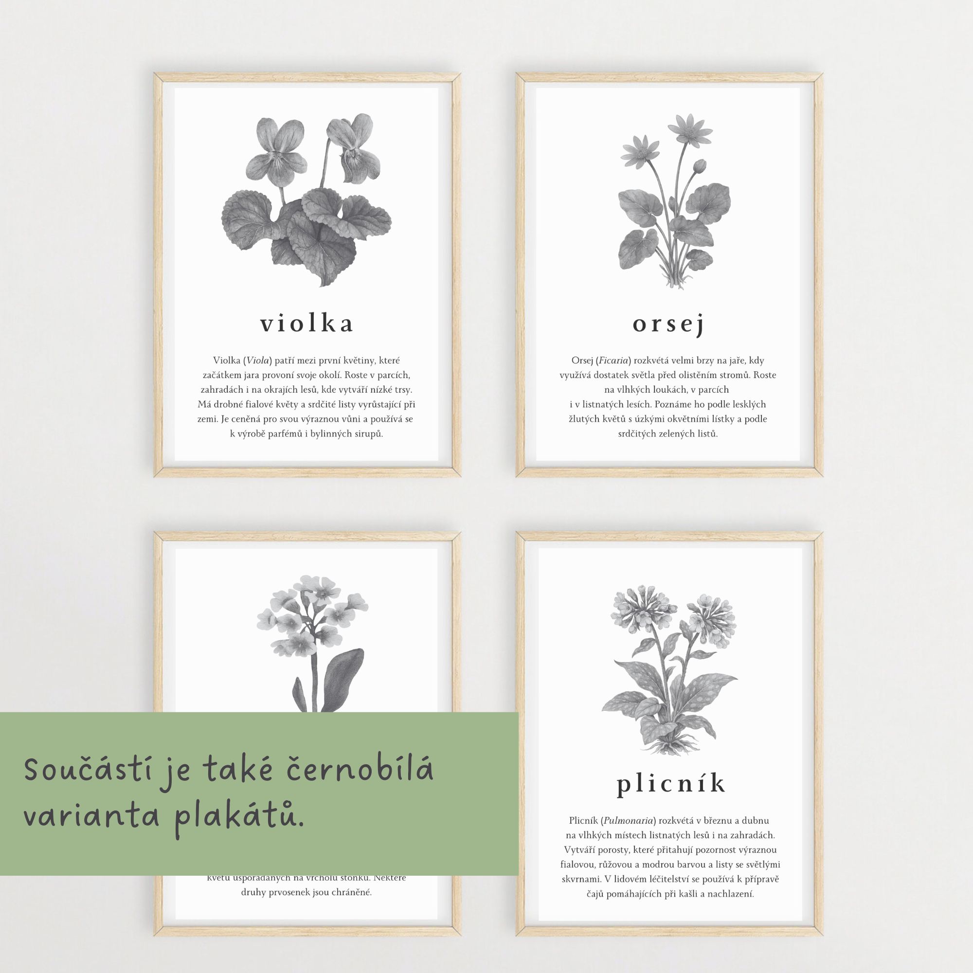 🌼Součástí souboru je 20 plakátů v barevné a 20 plakátů v černobílé variantě. Na každém z nich najdete rodové jméno květiny, stručnou charakteristiku (jak vypadá, kdy a kde roste, její zvláštnosti) a obrázek. Plakáty jsou laděné do tlumených tónů a jemných pastelových barev.
